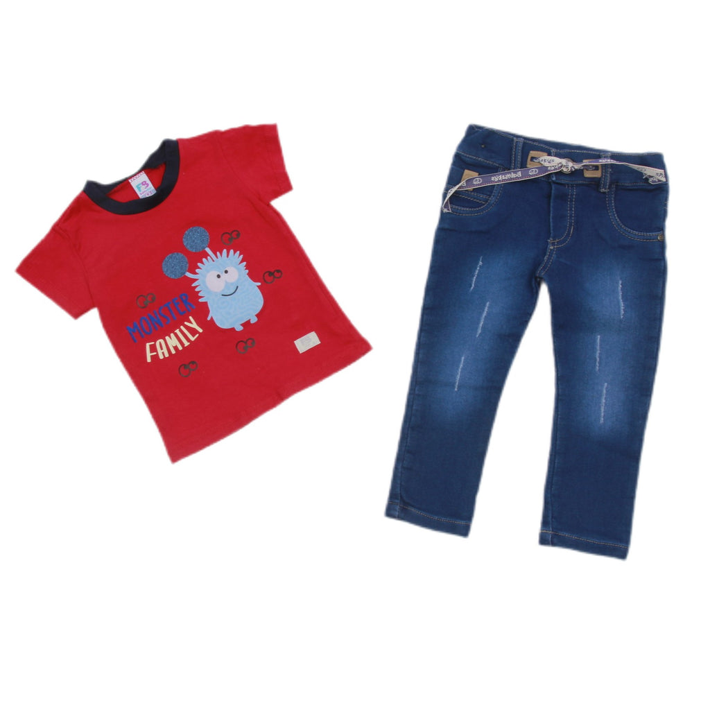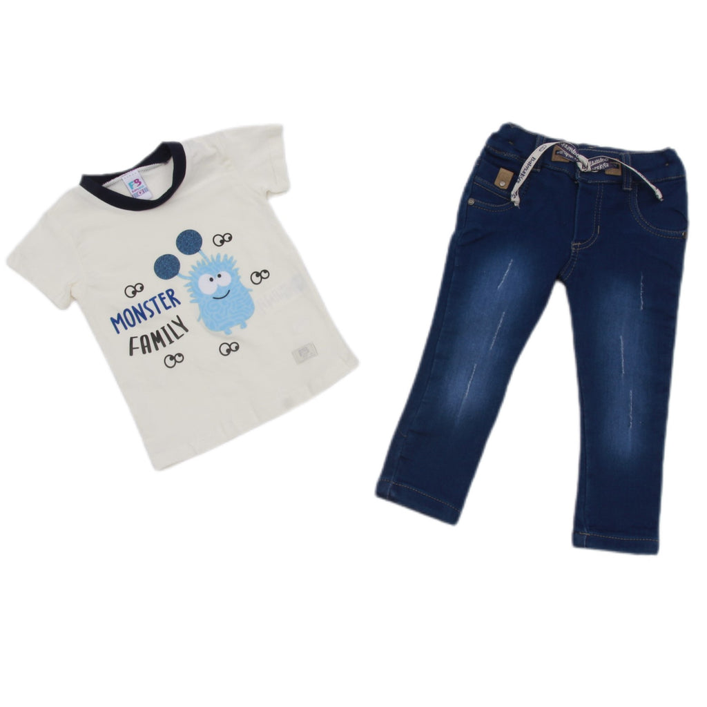 Set 2 piezas, contiene camiseta con estampado, cuello redondo, y jean con falsos bolsillos en el frente y ajuste en la cintura.