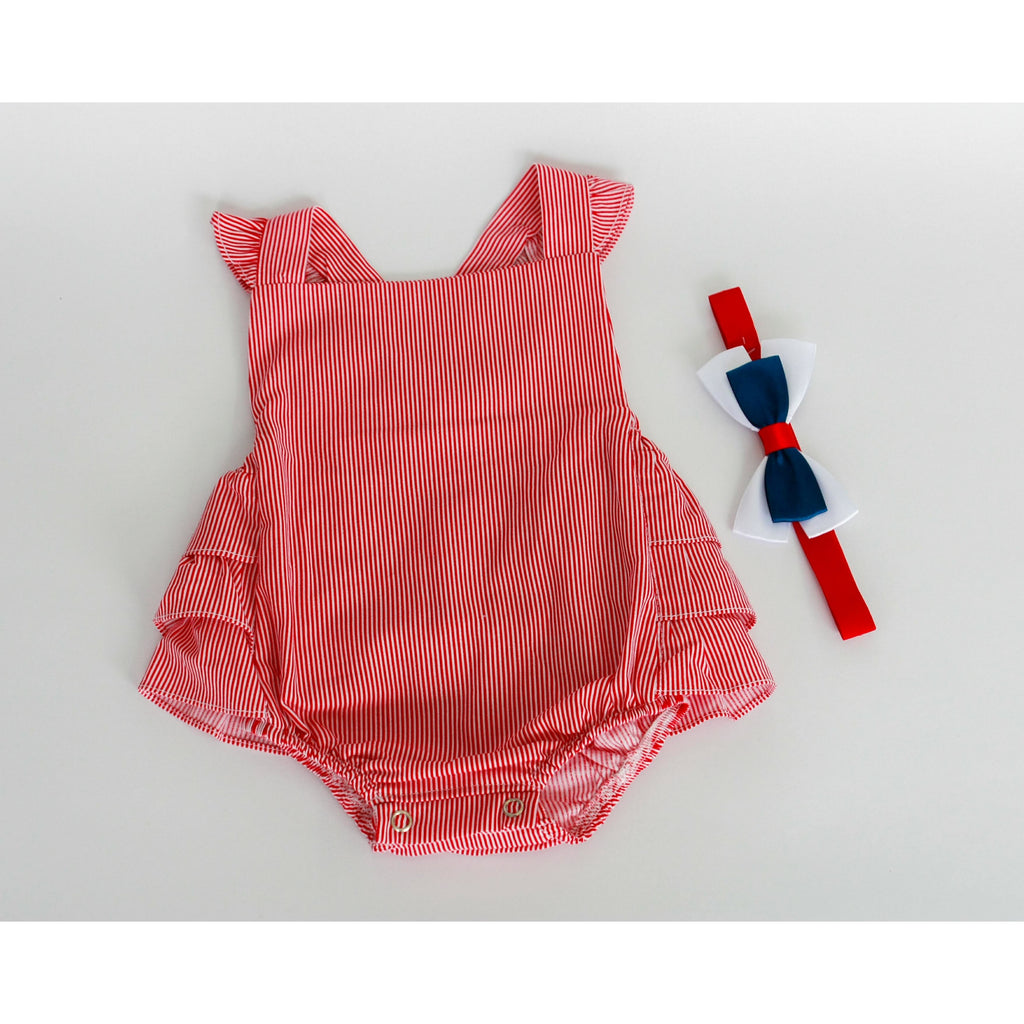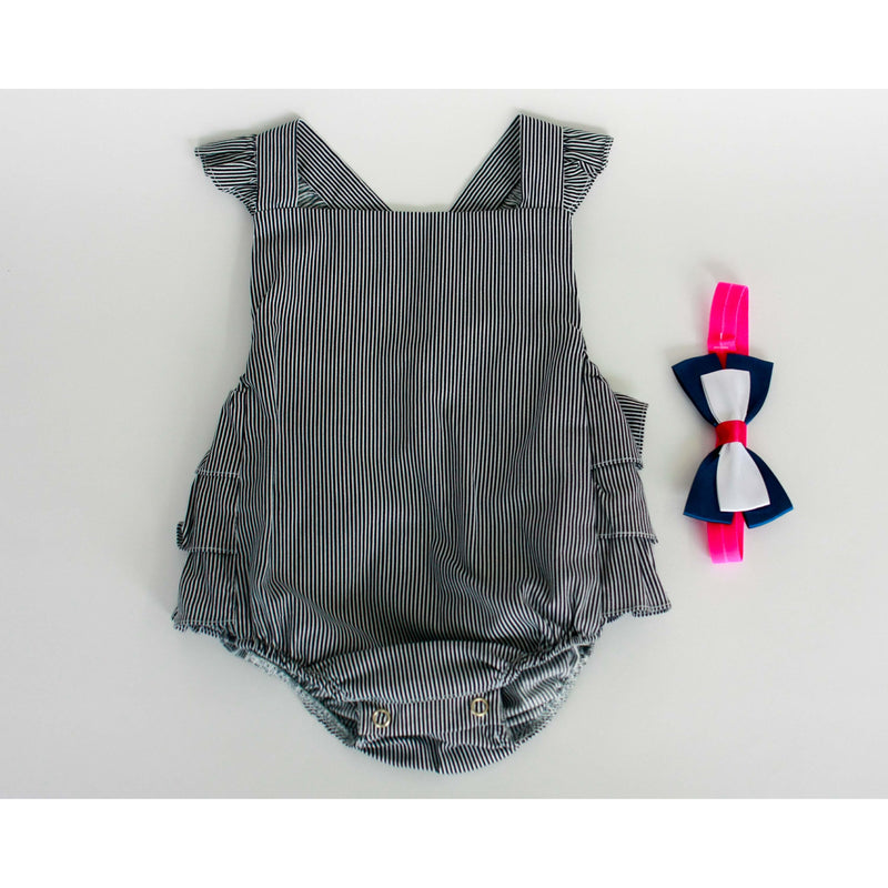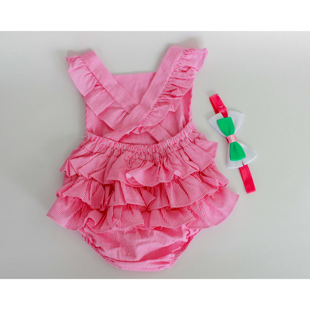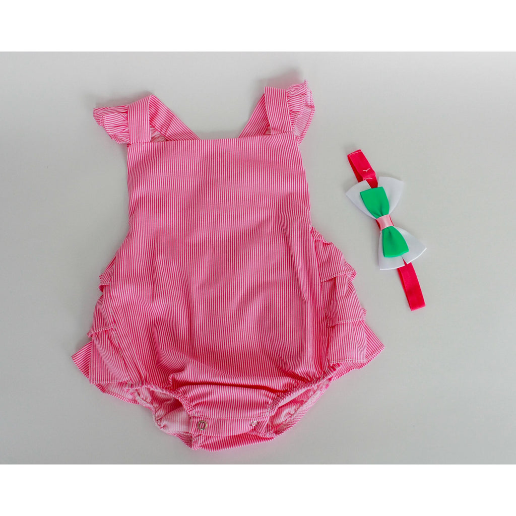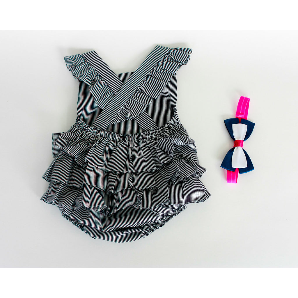 Hermoso asoleador en tejido plano con estampado de rayas y tirantes cruzados en la espalda. Broche en la parte baja.