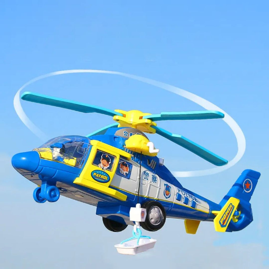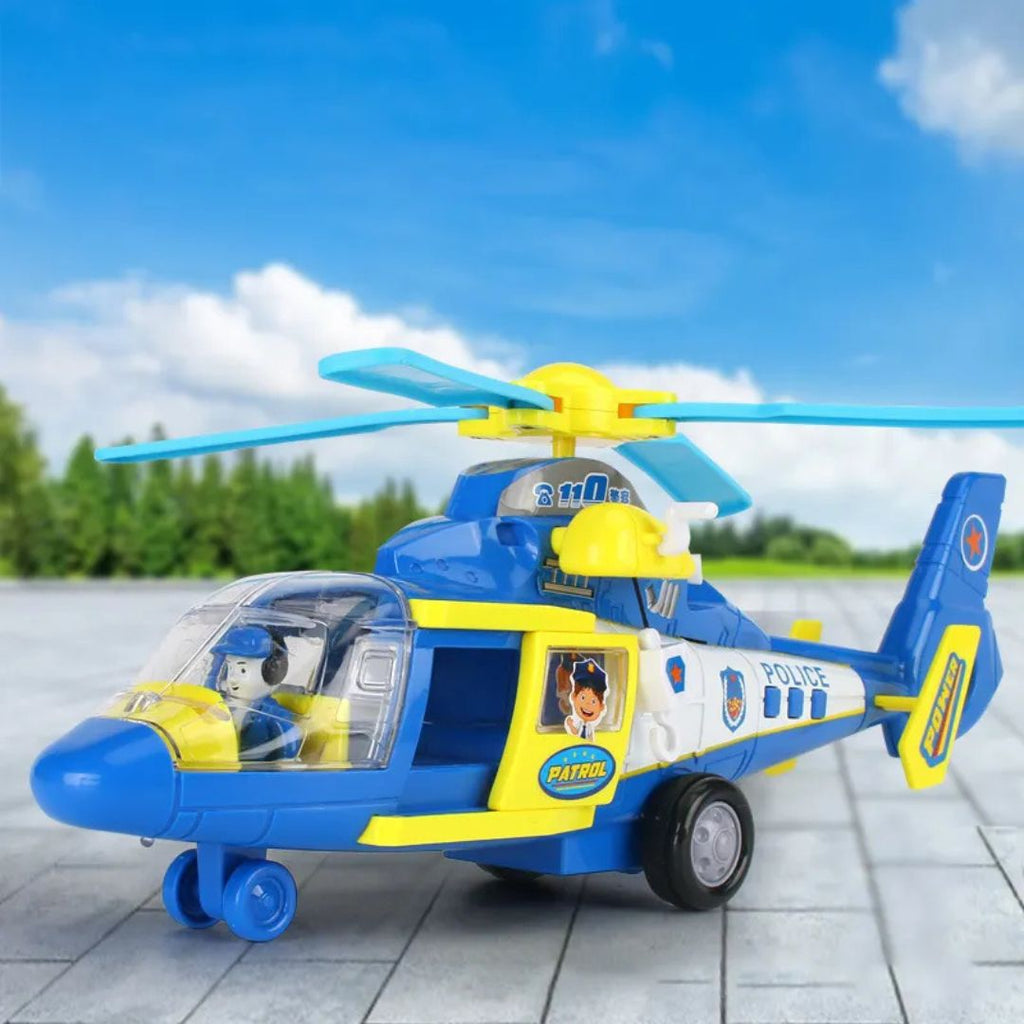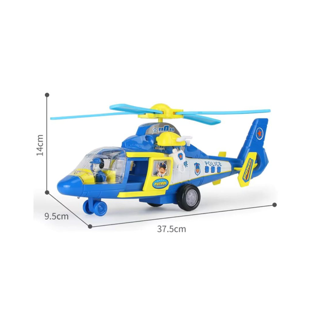 - El helicóptero tiene una hélice móvil, tiene efectos de luz y sonido, después de presionar uno de los tres botones, escuchará el sonido del motor del helicóptero despegando y aterrizando y el sonido de la sirena.