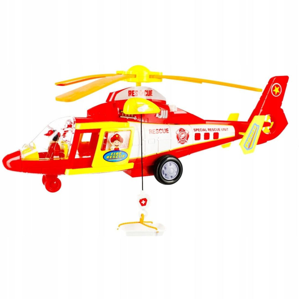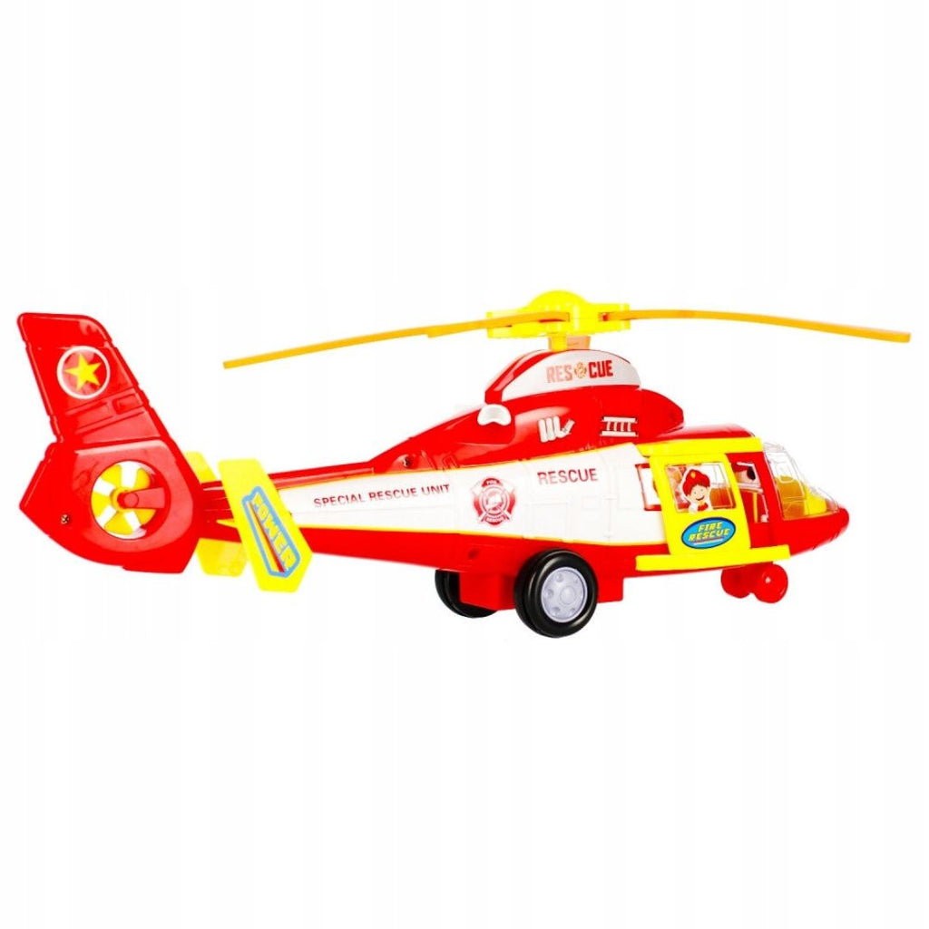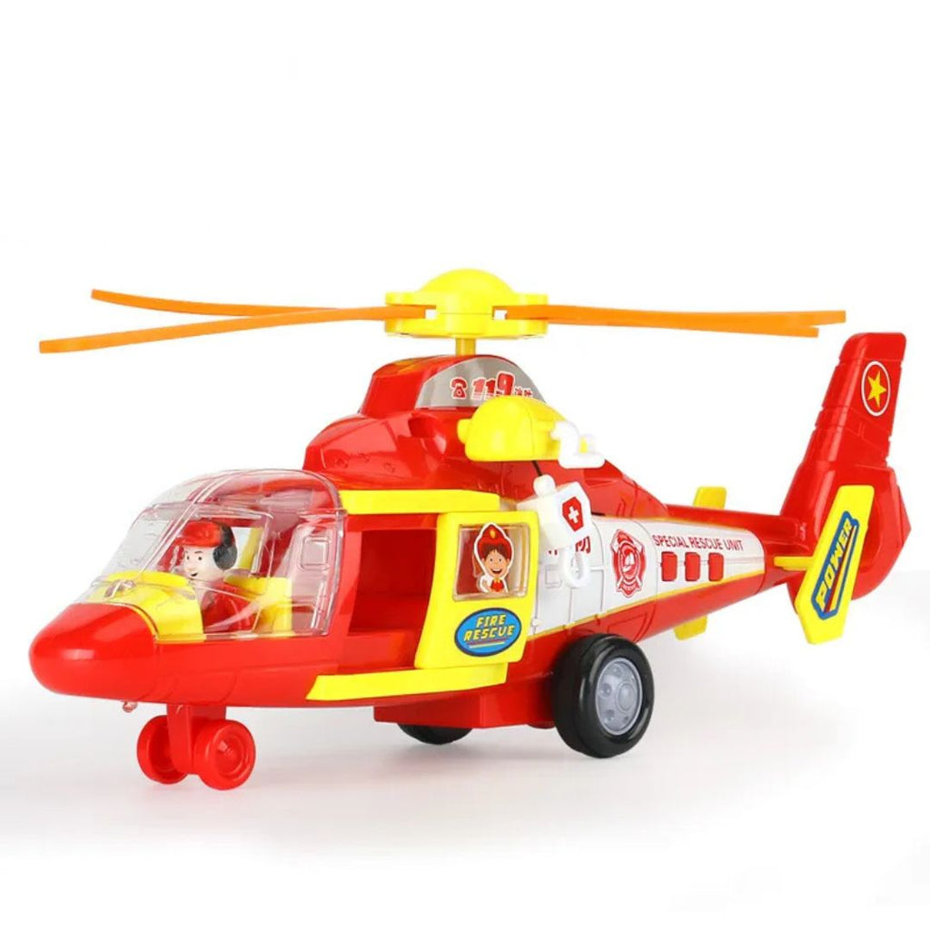 - El helicóptero tiene una hélice móvil, tiene efectos de luz y sonido, después de presionar uno de los tres botones, escuchará el sonido del motor del helicóptero despegando y aterrizando y el sonido de la sirena.