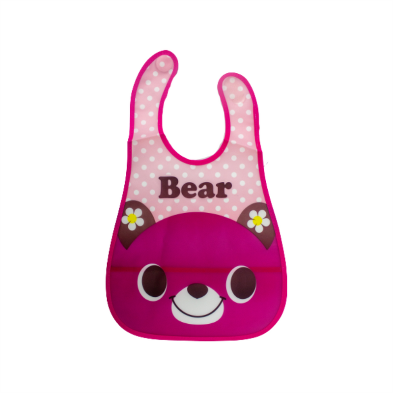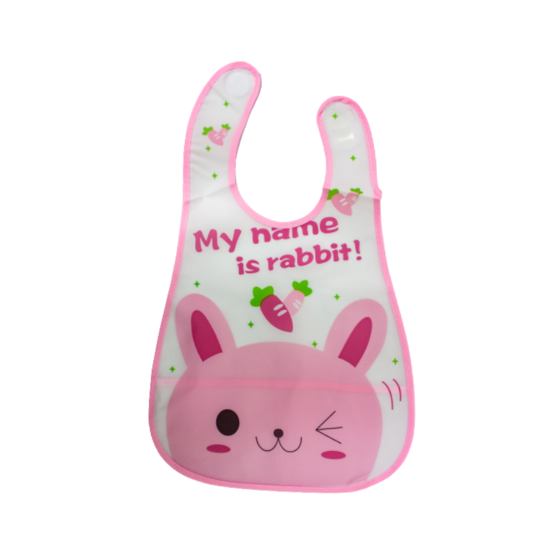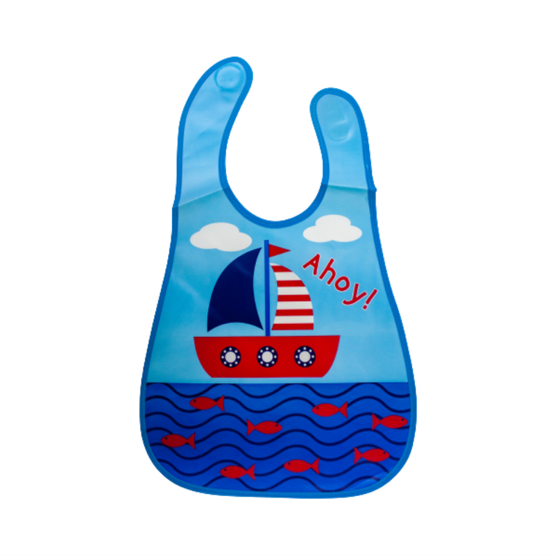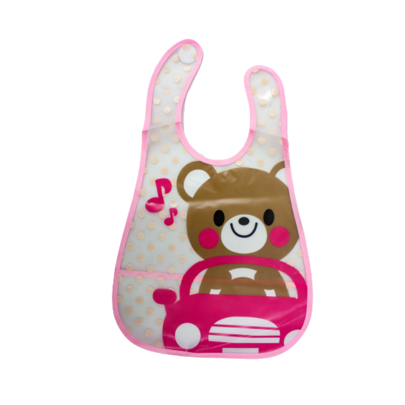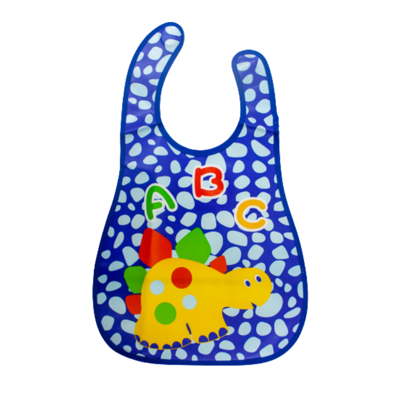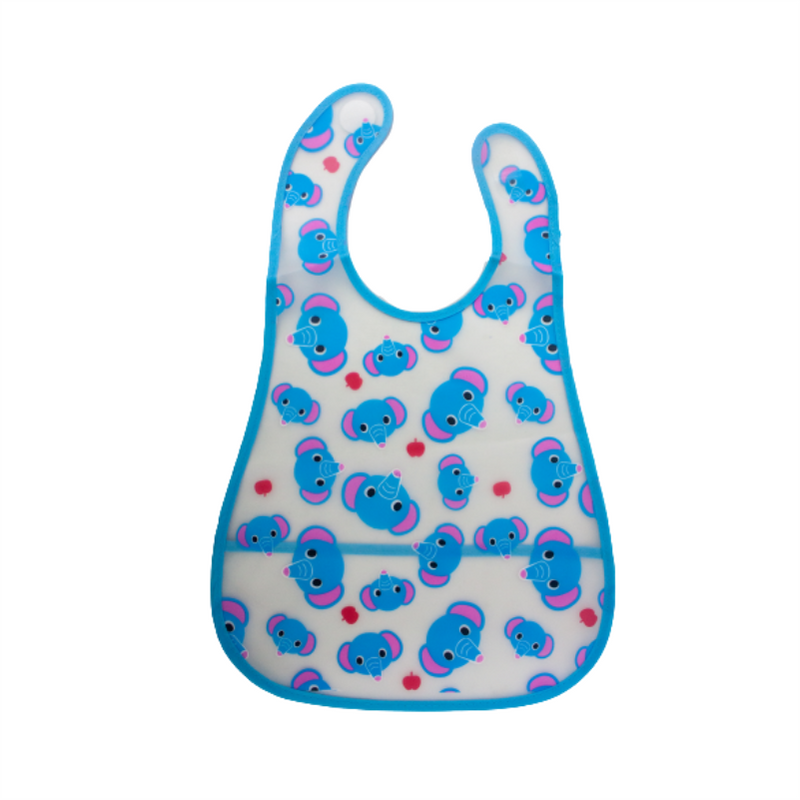 Babero para bebé plástico con bolsillo que facilita la recolección de los alimentos que el bebé deja caer.