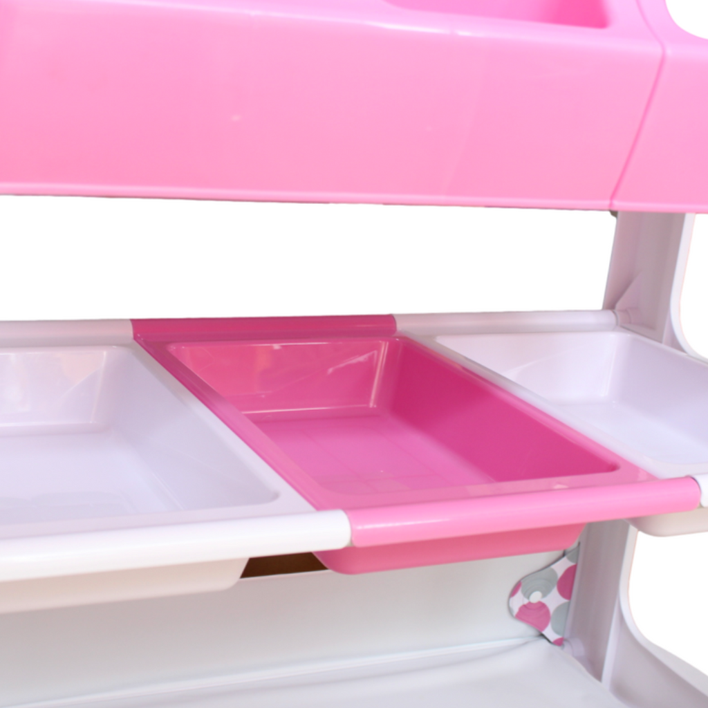 Baña a tu bebé seguro y cómodamente en esta hermosa bañera cambiador de Bebesitos. Podrás acomodar su cuenca expandible a las necesidades de tu bebé gracias a su opción acolchada para recién nacidos o totalmente expandida para niños más grandes. Ademas, tiene dos practicas bandejas organizadoras.