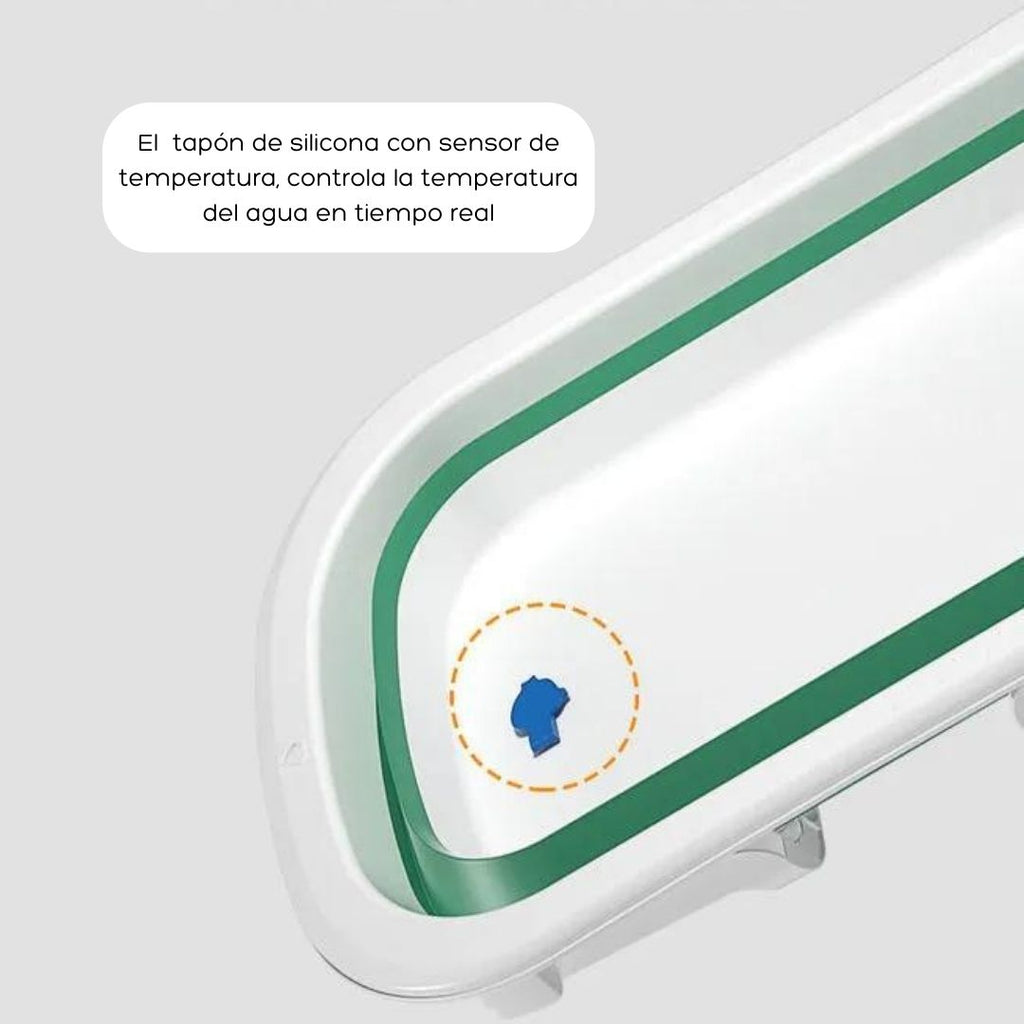 la Bañera para bebe plegable y portátil, cuenta con termómetro, alzador además es fácil de guardar y llevar a cualquier lugar por su fácil plegado, cuenta con tapón de desagüe y dos patas (bases) antideslizantes y capacidad de hasta 30 litros.