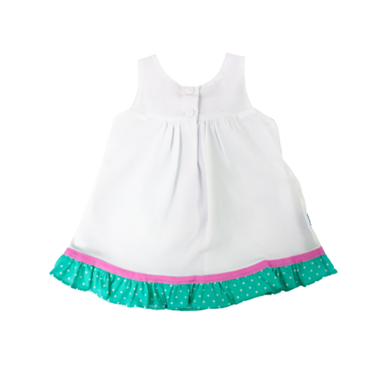 Bata para niña con lindo estampando y detalle de lazo en el frente, sin manga. Contiene cintillo ajustable y panty.