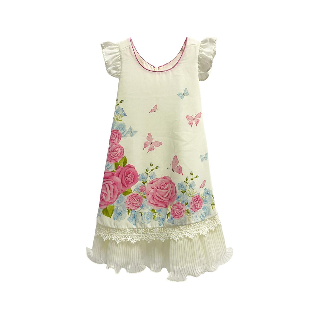 Vestido para niña con estampados de flores, sin mangas. Contiene tapaboca estampado y cintillo.