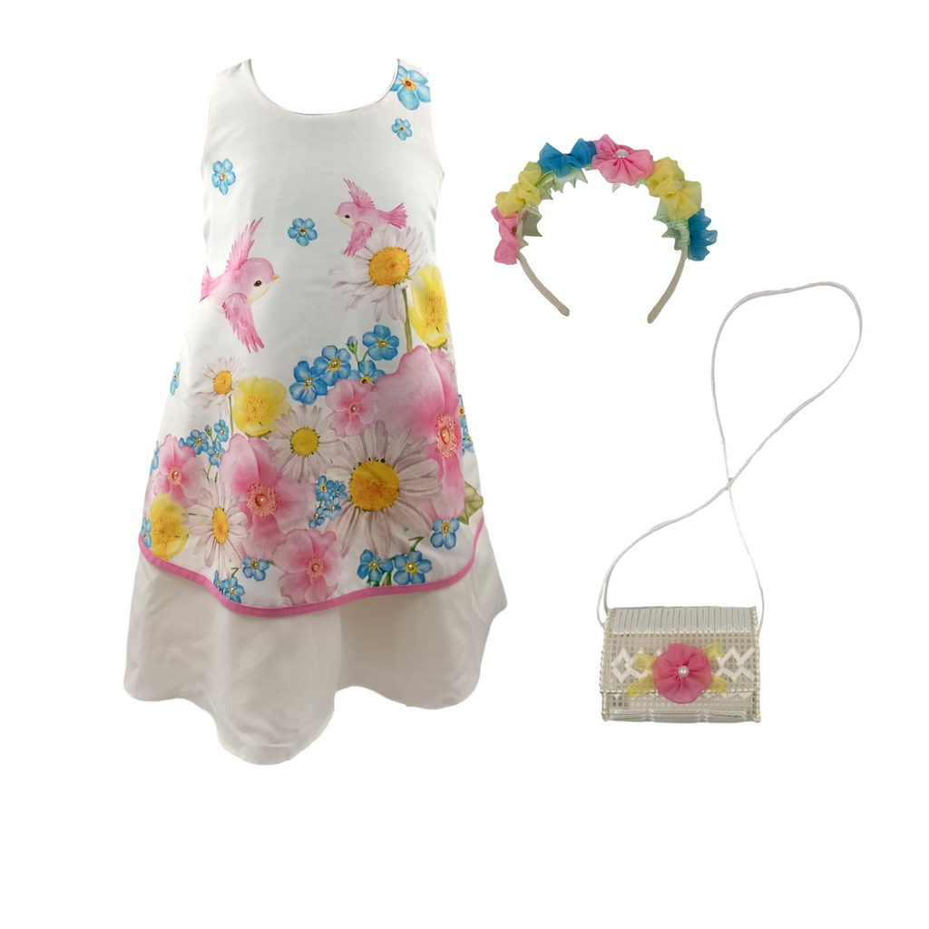 Vestido para niña con estampados de flores, sin mangas. Contiene accesorios.