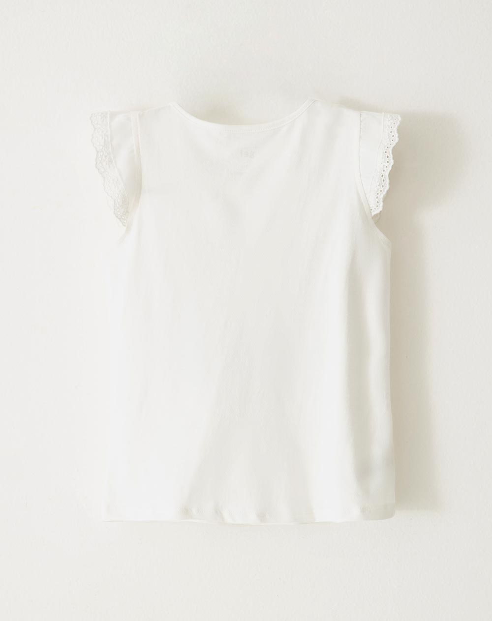 Camiseta cuello redondo estilo casual manga sisa con bolero decorativo en el hombro. Elaborado en algodón, el cual proporciona suavidad y frescura ideal para la piel del bebé. Hecha libre de químicos y pesticidas.