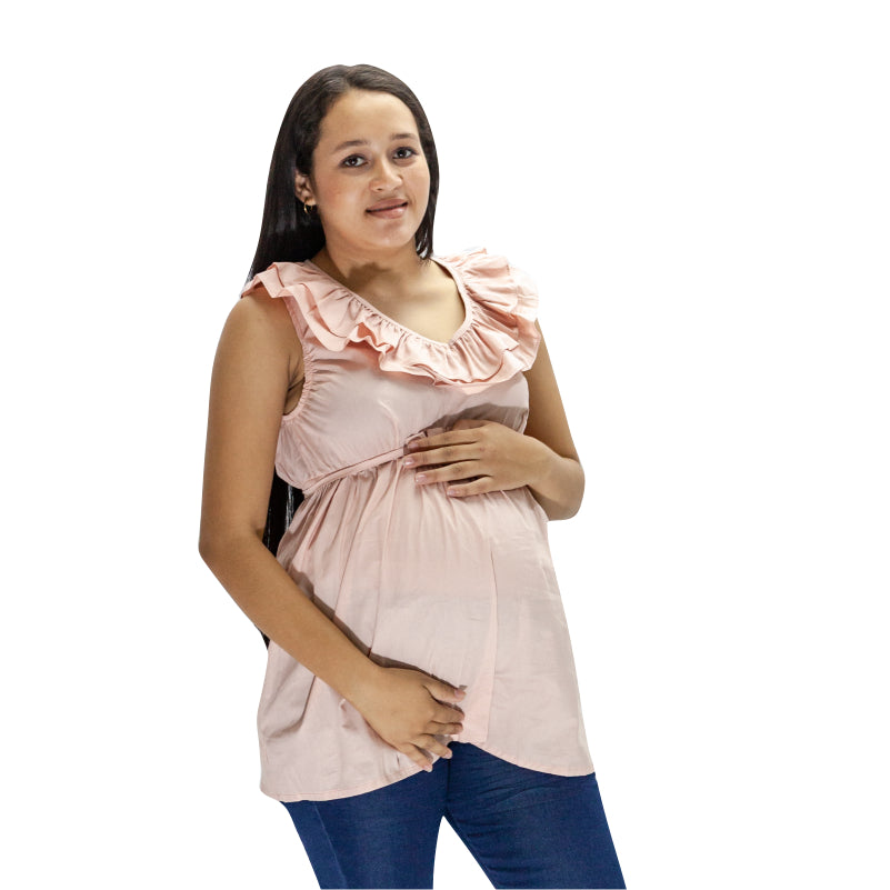Blusa materna unicolor sin mangas y cuello estilo boleros. Cintura ajustable con lazo. Elaborada en tela suave para mayor frescura y comodidad.