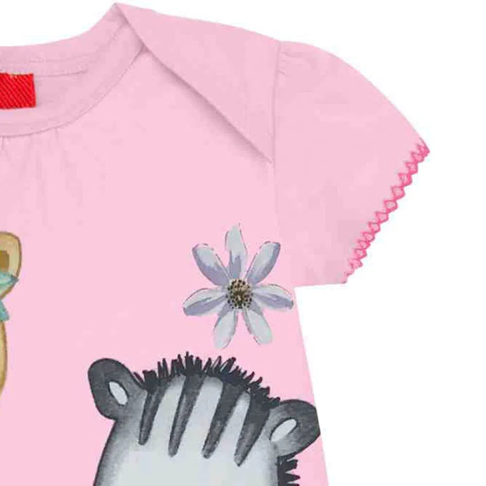 Pelele de bebé niña Kyly confeccionado en Half Mesh , tiene un estampado frontal de animales con detalles de glitter, terminaciones en las mangas con punto piquete, ligero volante en el escote delantero y elástico en la pierna para volante. También tiene hombros cruzados y abertura en la entrepierna con cierre de botones a presión.