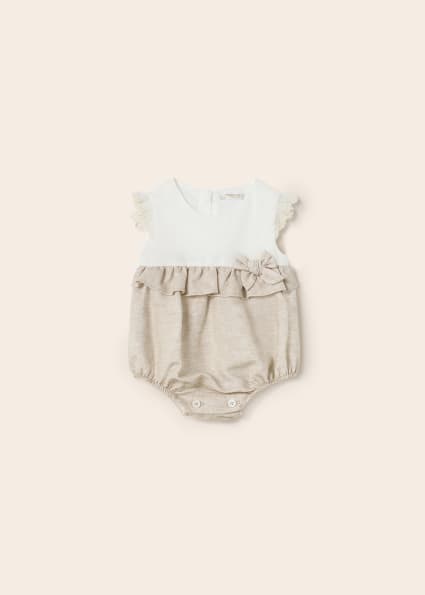 Hermoso body sin mangas para recién nacido. Cierre con botones a presión en la entrepierna para facilitar la puesta de la prenda. Cierre con cremallera trasera invisible. Tejido de aspecto fresco y actual con lino. Elementos de adorno: volantes decorativos. Modelo perteneciente a nuestra línea más elegante y exclusiva pensada para vestir a los más pequeños en las ocasiones más especiales.