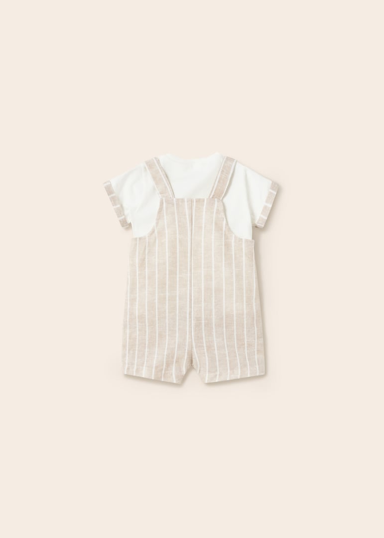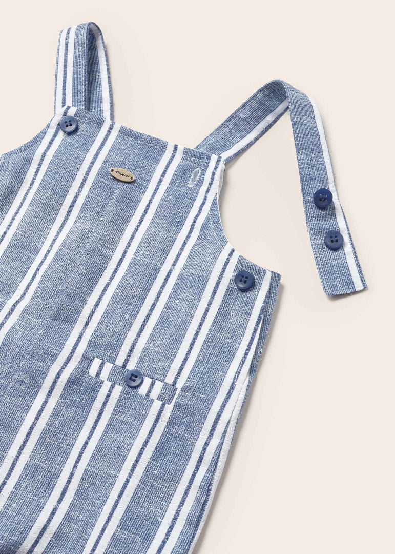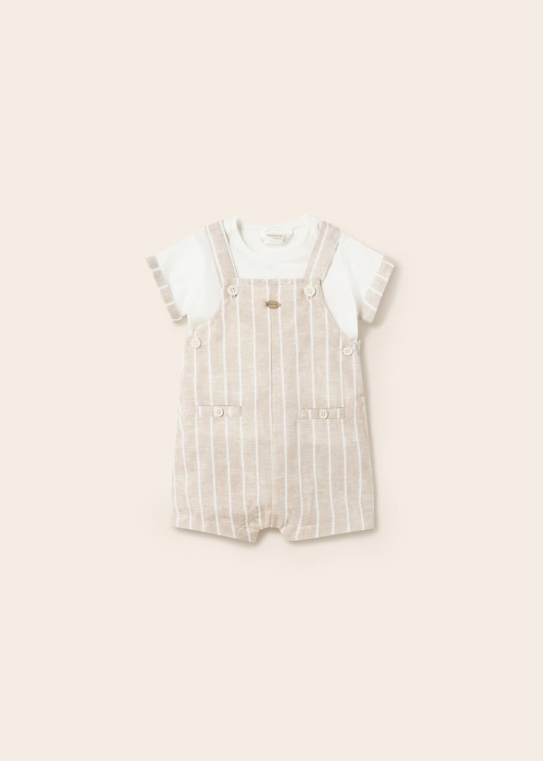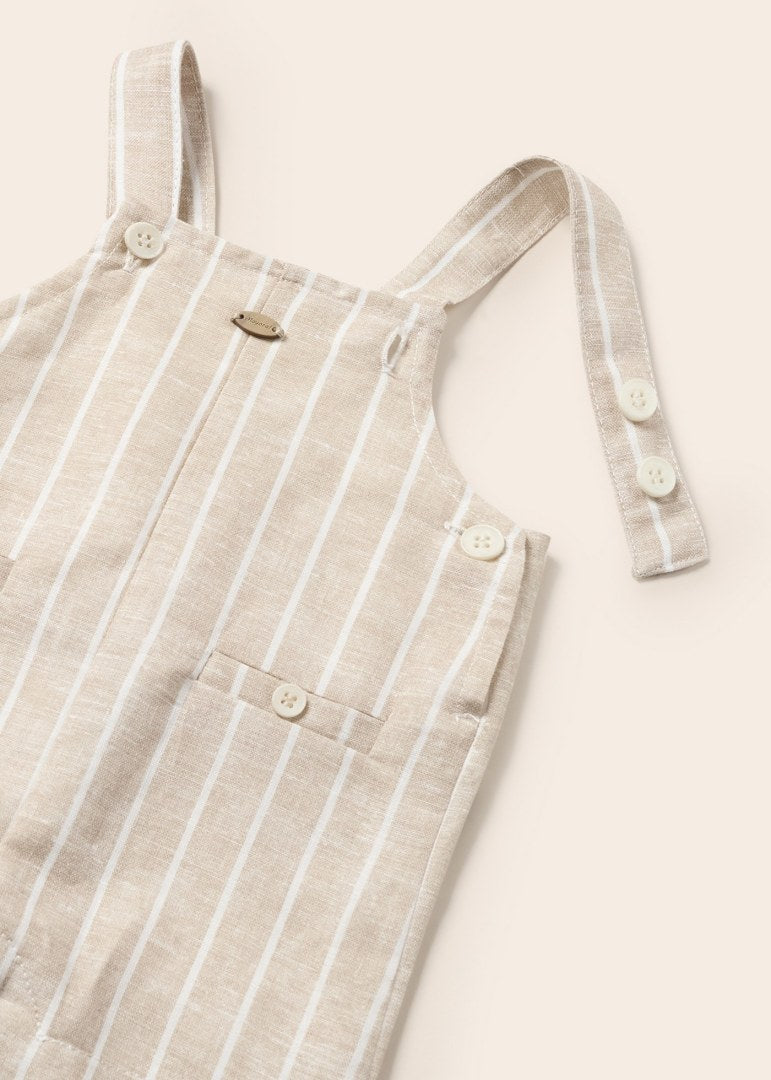 Diseño con tirantes. Cierre con botones a presión en la entrepierna para facilitar la puesta de la prenda. Tejido de aspecto fresco y actual con lino. Bolsillos delanteros decorativos simulados. Motivo de rayas.