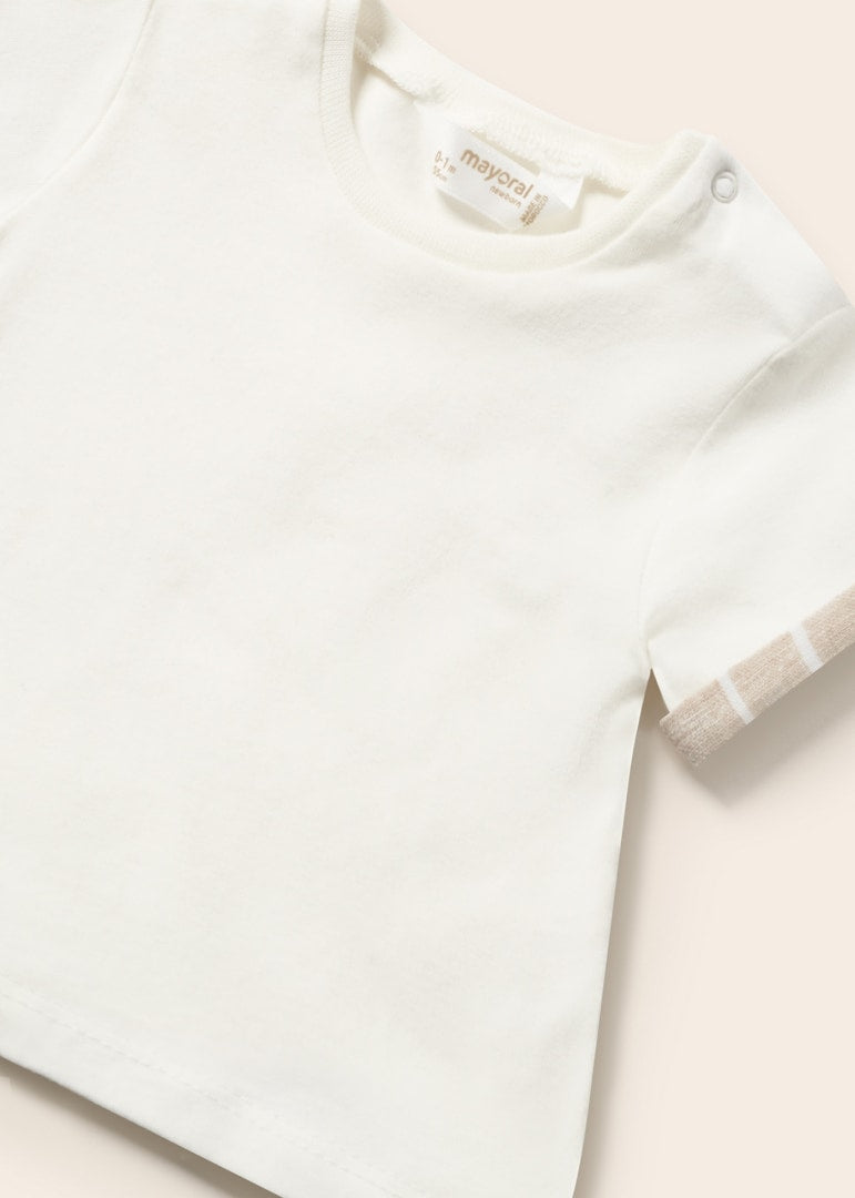 Camiseta de manga corta para recién nacido. Cuello redondo. Cierre con botones en el hombro. Suave tejido de algodón elástico.