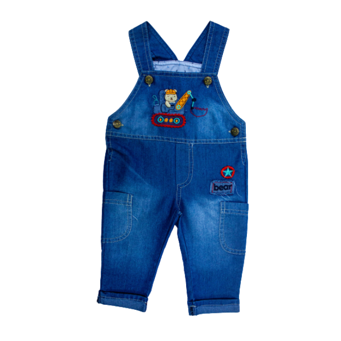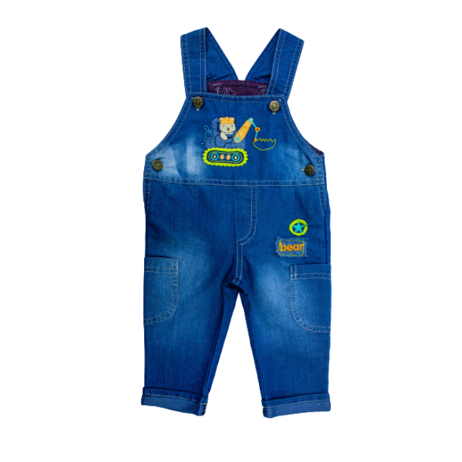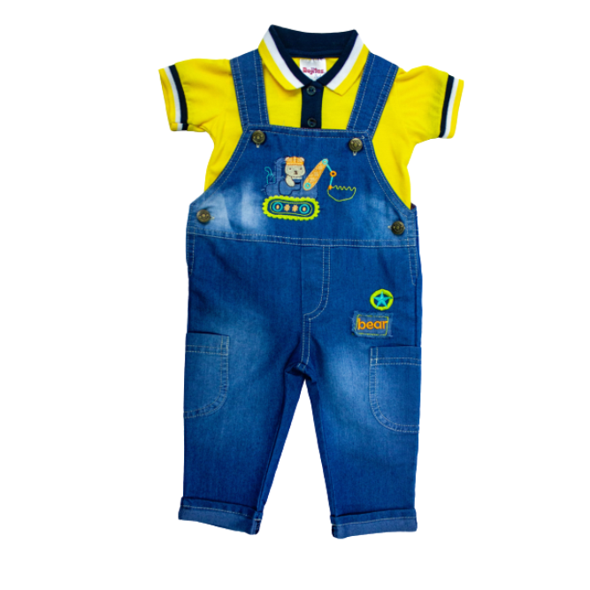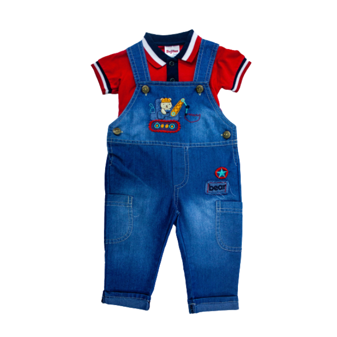 Conjunto braga con bordado y bolsillos, botones en los tirantes y en los lados que facilitan la hora de cambiarlo. Camiseta unicolor tipo polo con botones en el cuello. Elaborado en algodón.