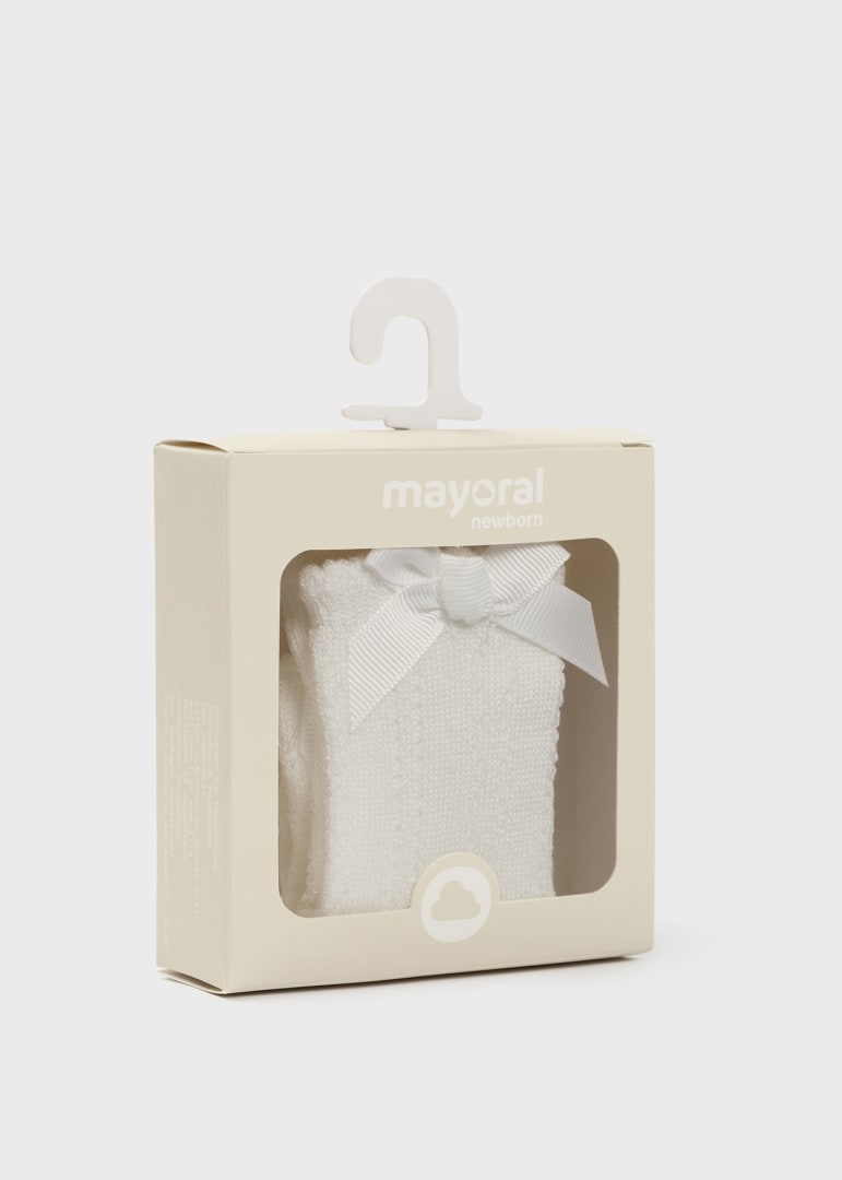 Calcetines para recién nacido. Un accesorio perfecto para completar su look, dándole un toque diferente. Elementos de adorno: motivos calados, aplique de lazo. Este artículo se presenta en una caja de la línea Newborn ideal para regalar en ocasiones especiales.
