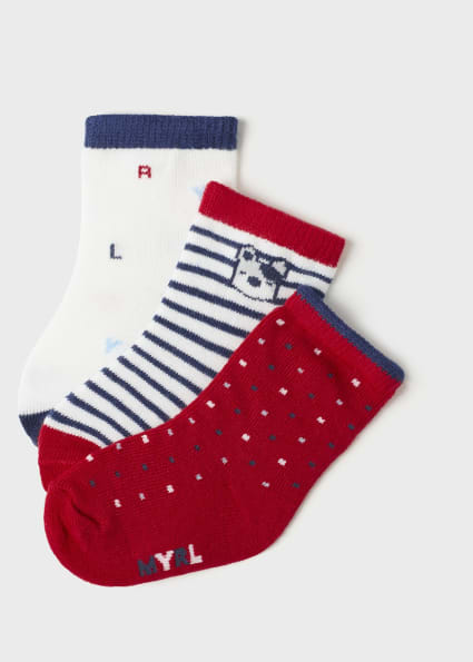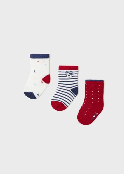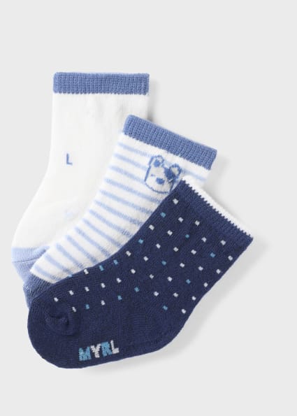 Práctico set de tres pares de calcetines para recién nacido. Diseño con delicados motivos infantiles.