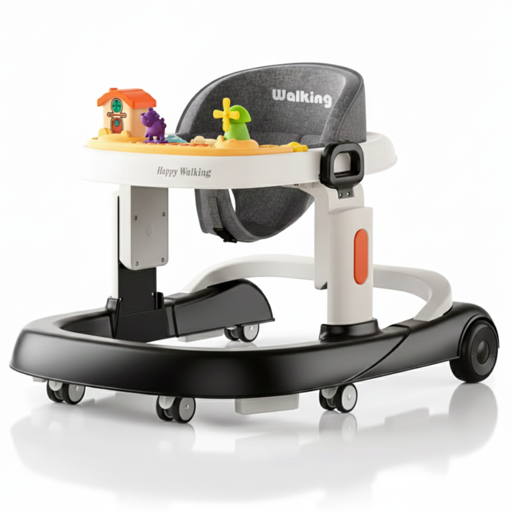 • El andador para niños se puede plegar hacia abajo y quedar plano, lo que puede facilitar su transporte o almacenamiento conveniente cuando no esté en uso.