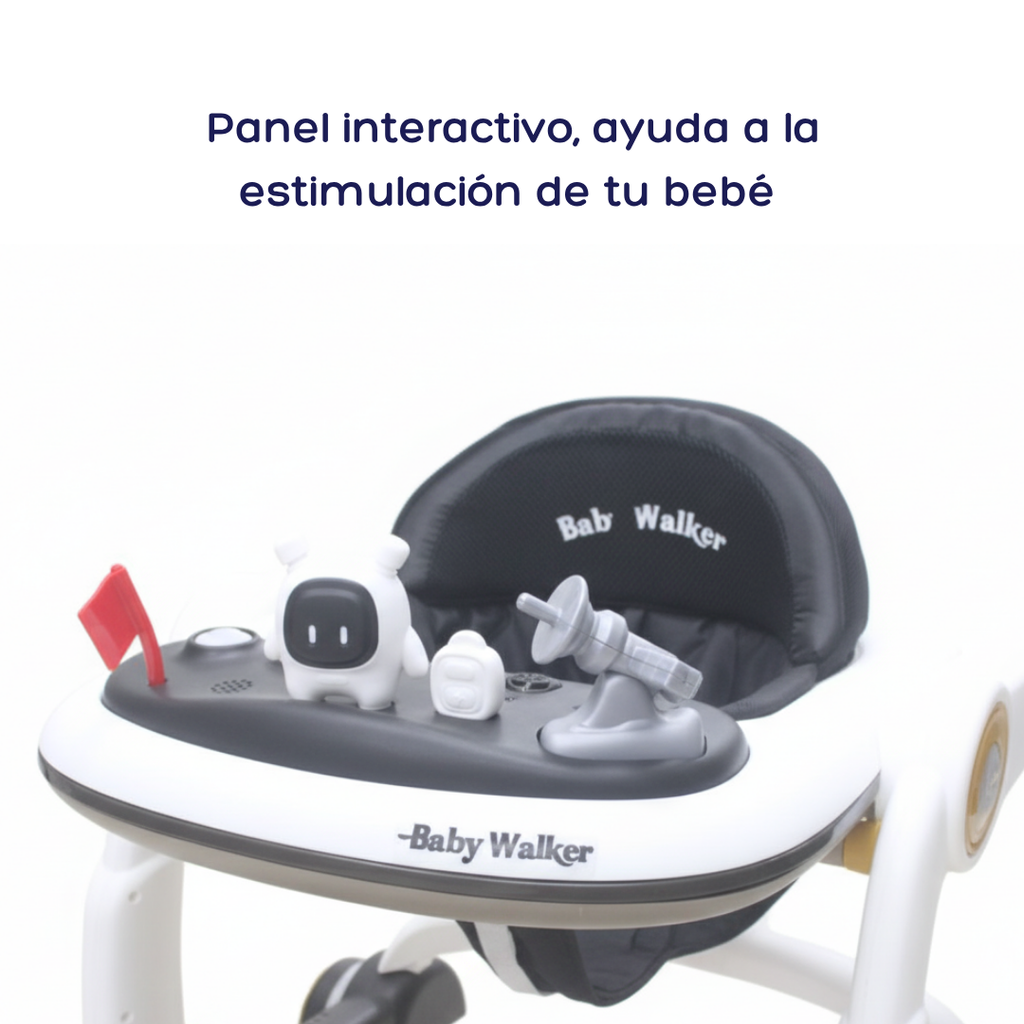 - Tiene 3 posiciones de altura ajustables, una bandeja de juegos interactiva con luces y sonidos, ruedas suaves y direccionales, y un asiento acolchado.