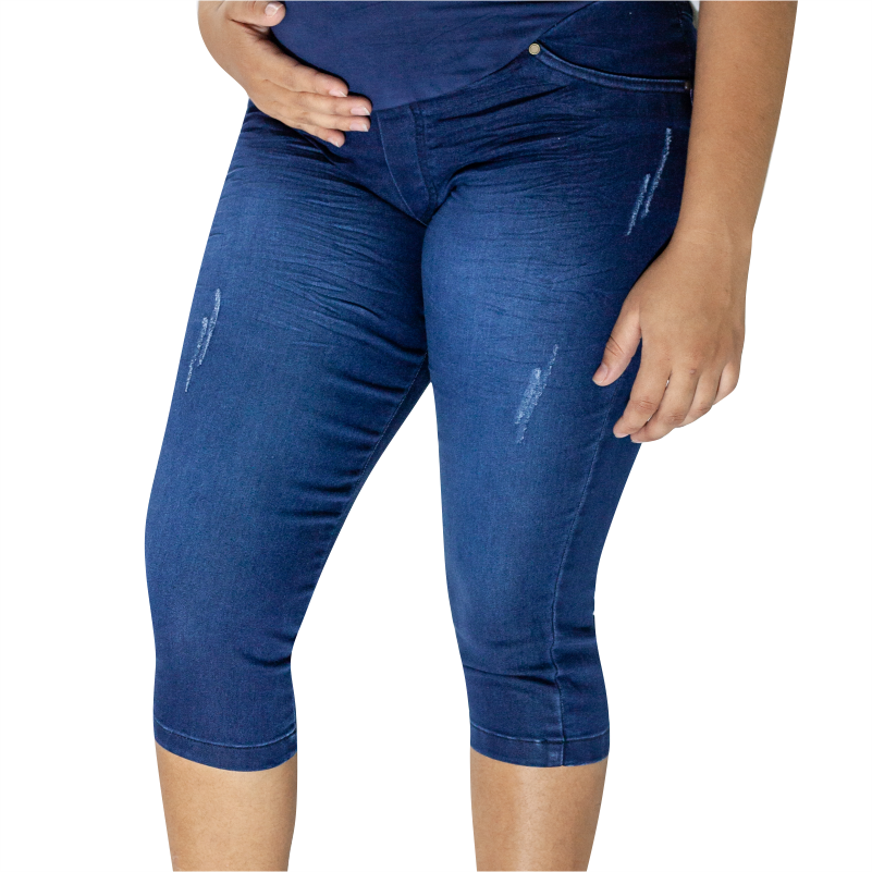 Capri de jeans con falsos bolsillos en la parte de adelante y elástico en cintura para garantizar el ajuste de forma suave y cómoda. Contiene adornos decorativos.