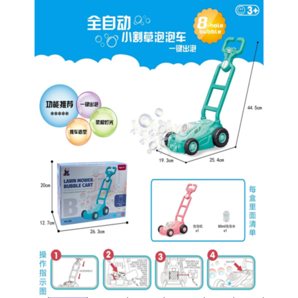 - Fácil de usar: Simplemente añade la solución, enciende el carrito y disfruta de un espectáculo de burbujas.