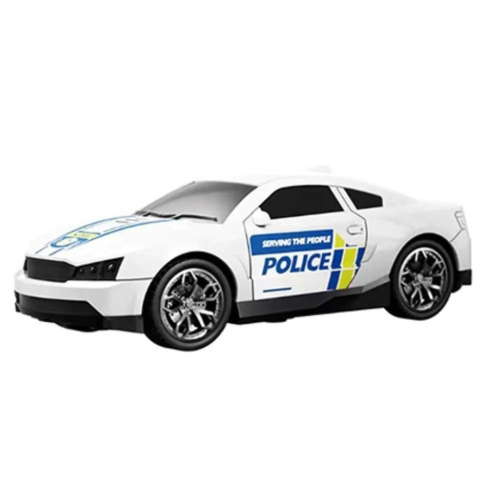 El set incluye un helicóptero de la "Air Police" en azul y negro con rotores detallados, y un coche patrulla deportivo de diseño moderno en color blanco. Ambos modelos están equipados con funciones de luz y sonido que se activan mediante botones, emitiendo sirenas y efectos de emergencia realistas.