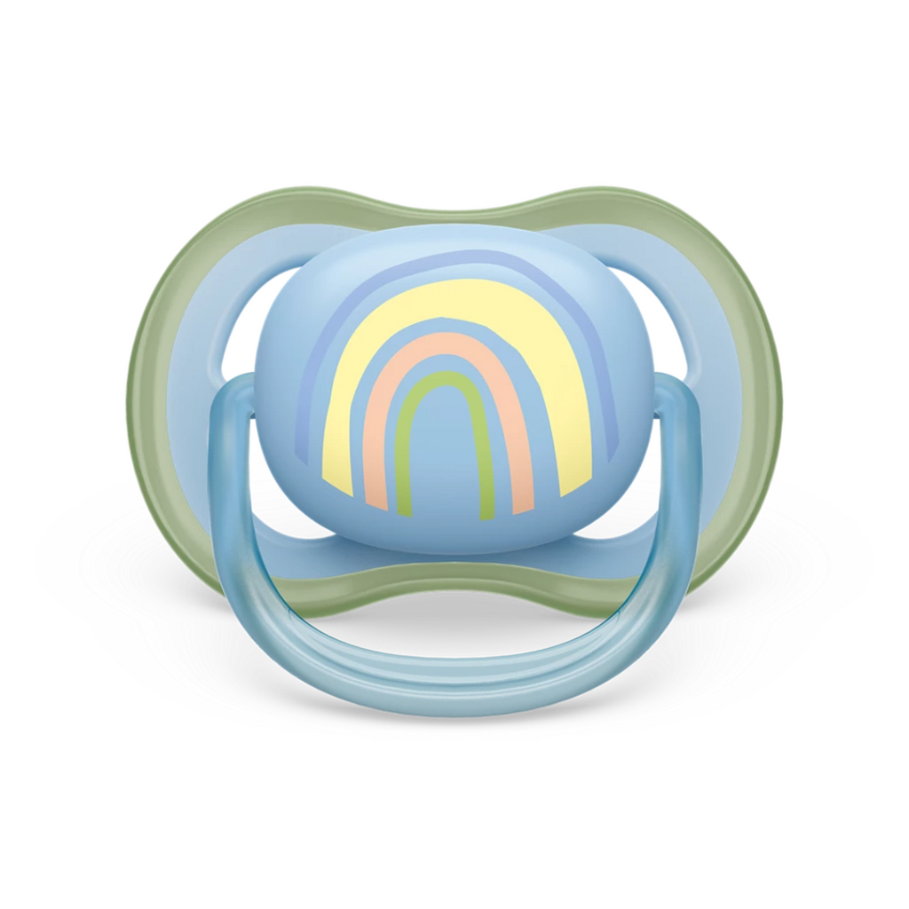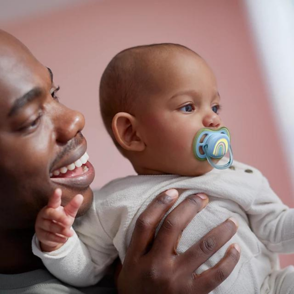 Chupete especialmente diseñado para proteger las mejillas del bebé con piel sensible. Minimiza las marcas y la irritación de las mejillas y alrededores de la boca del bebé.