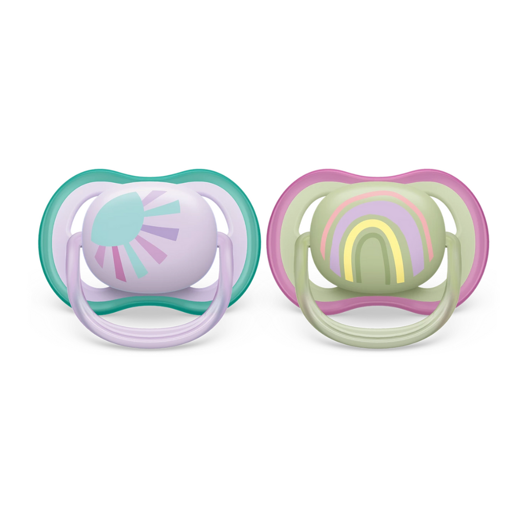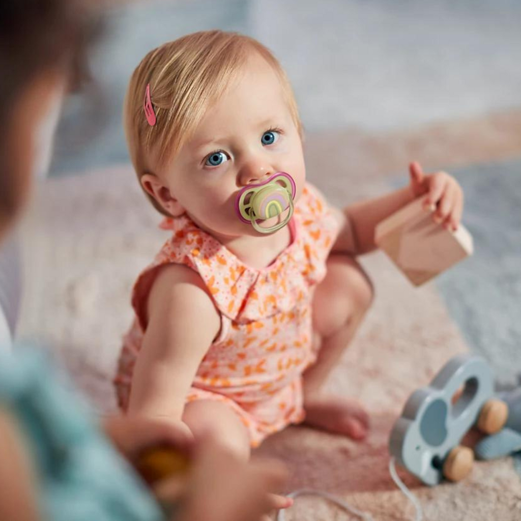 Chupete especialmente diseñado para proteger las mejillas del bebé con piel sensible. Minimiza las marcas y la irritación de las mejillas y alrededores de la boca del bebé.