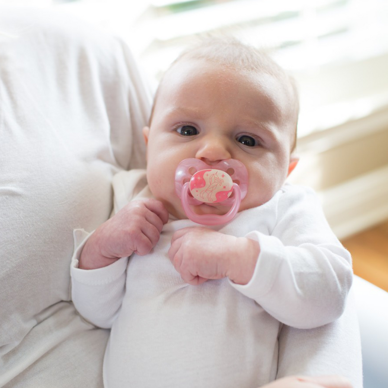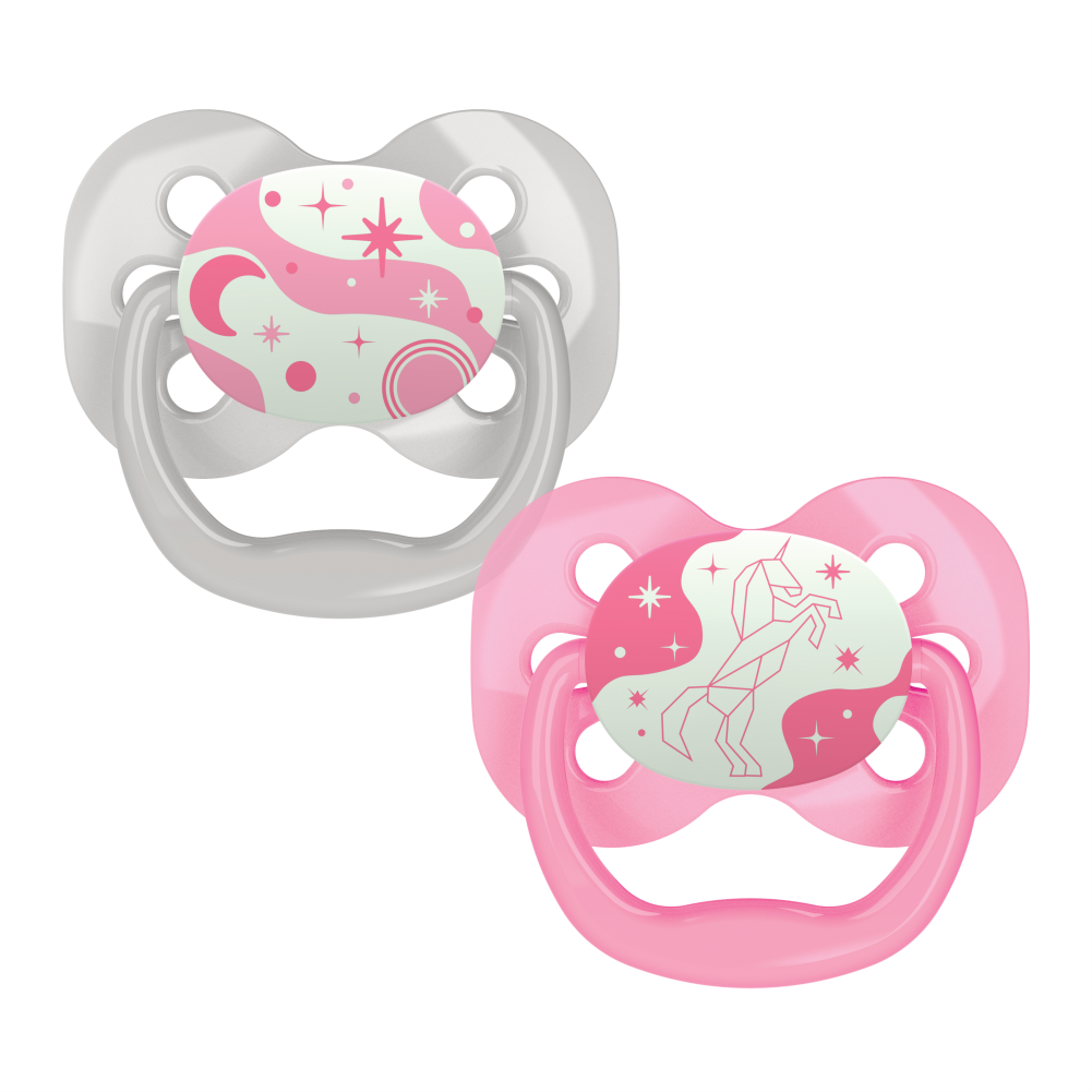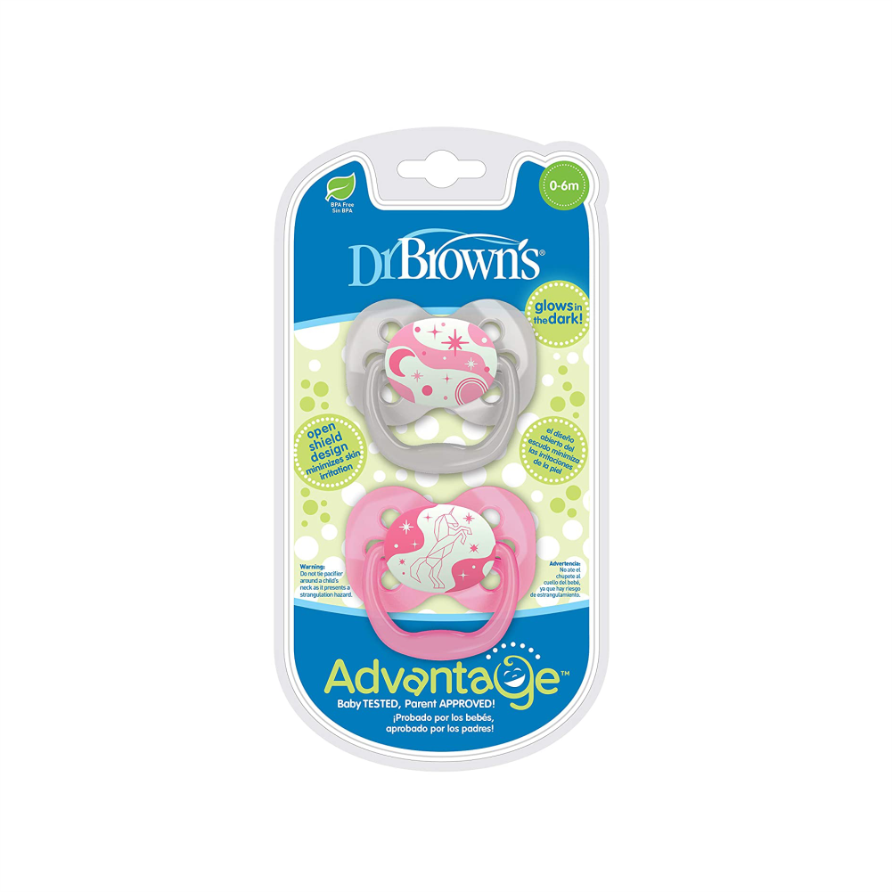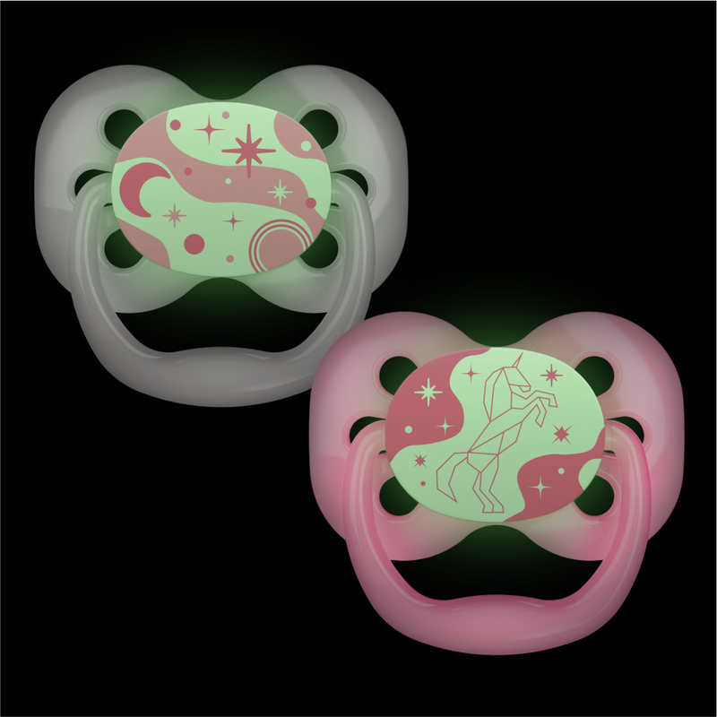 El chupete Advantage es funcional, efectivo y adorable y brilla en la oscuridad para que sea más fácil de encontrar por la noche. ¡Recargue fácilmente con la luz del día siguiente!