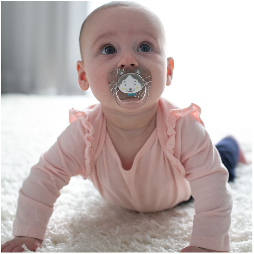 Chupo de entretención Prevent nivel 2 (6 - 18 meses) diseñado por un dentista pediátrico para prevenir los problemas dentales. Incluye un canal de aire sin succión que ayuda a reducir la succión y la presión en el paladar que pueden causar problemas dentales, como la mordida cruzada. La suave tetina se extiende cuando el bebé succiona, ofreciéndole consuelo con un nivel bajo de presión.