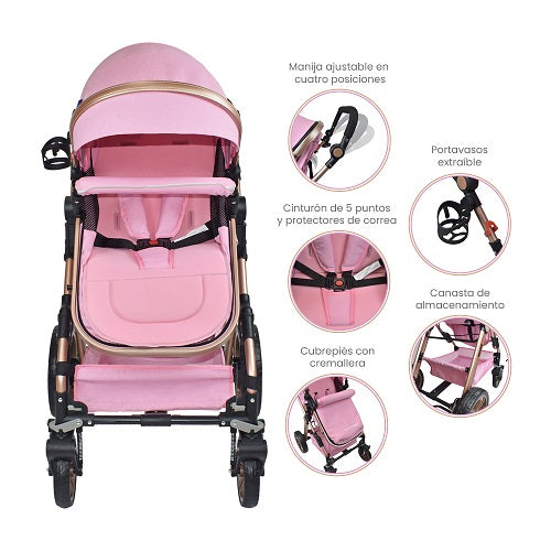 - Además tiene una amplia canasta de almacenamiento, un porta tetero lateral, capota con visor, cubrepiés y muñequera.