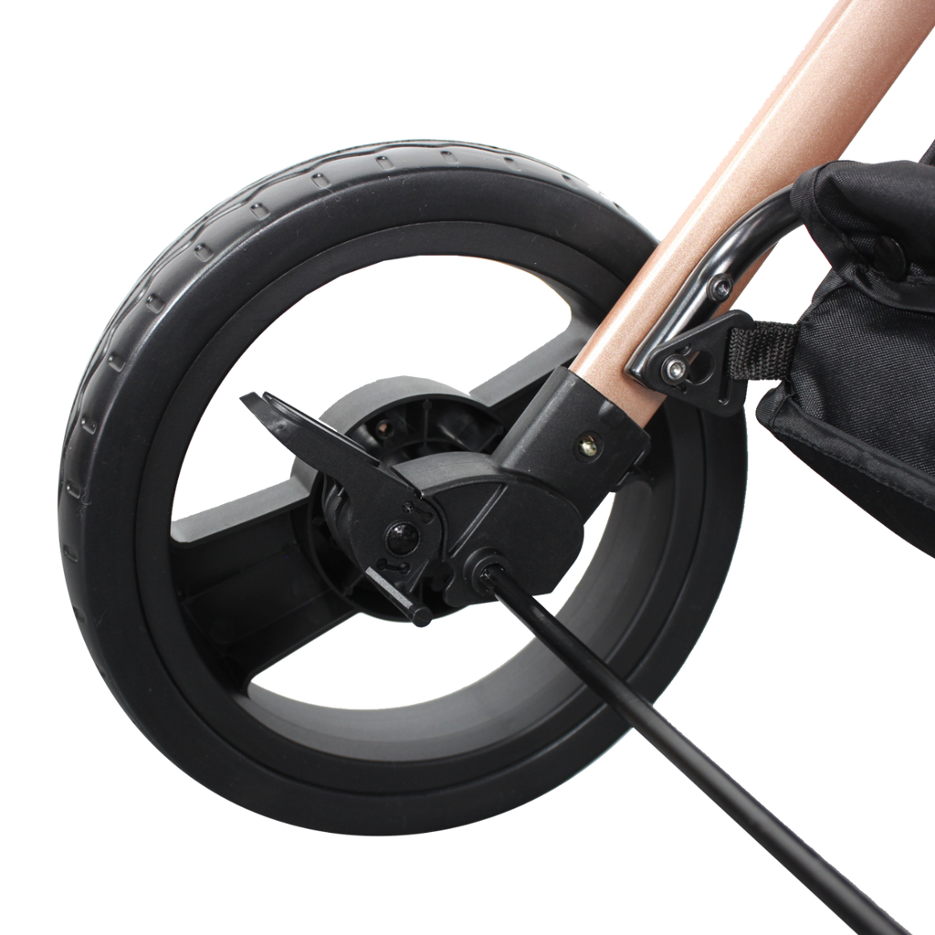 - Estructura Dorada Robusta: La estructura dorada del cochecito no solo agrega un toque elegante, sino que también proporciona una base sólida y duradera para el asiento y los componentes.