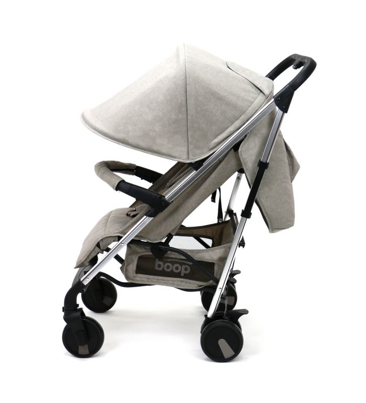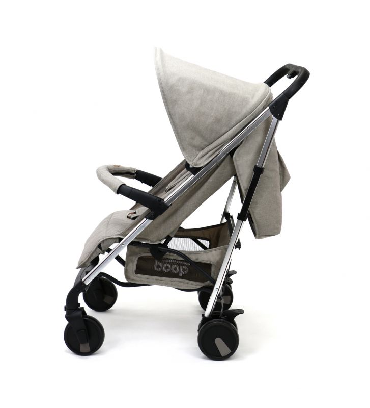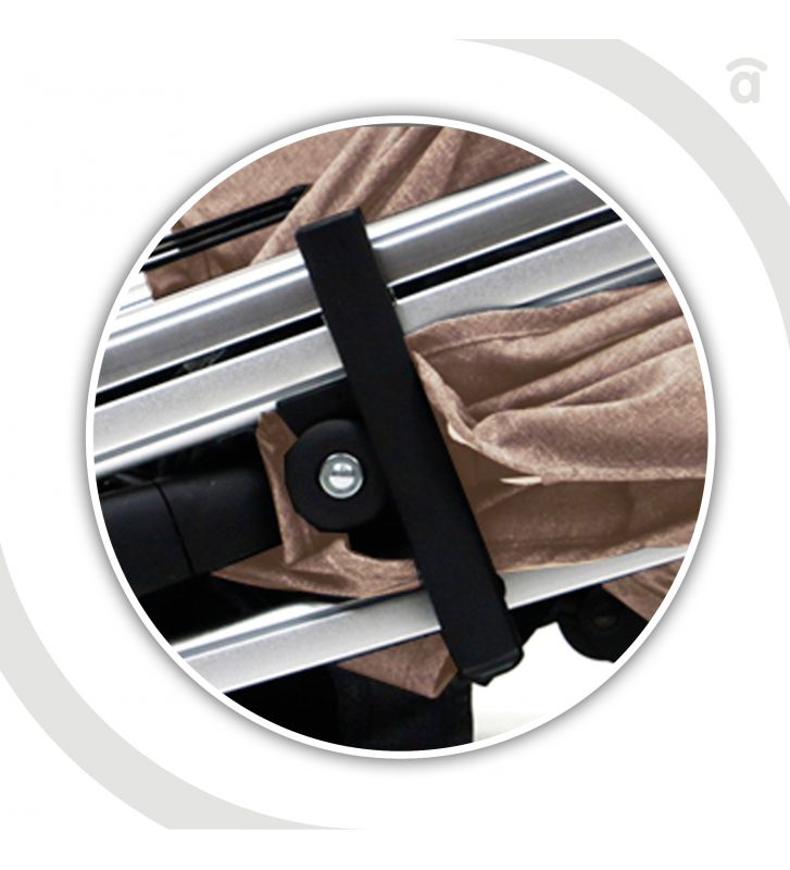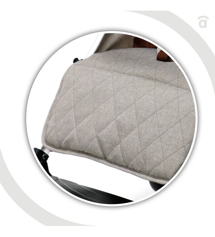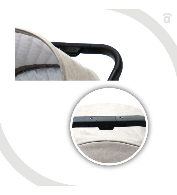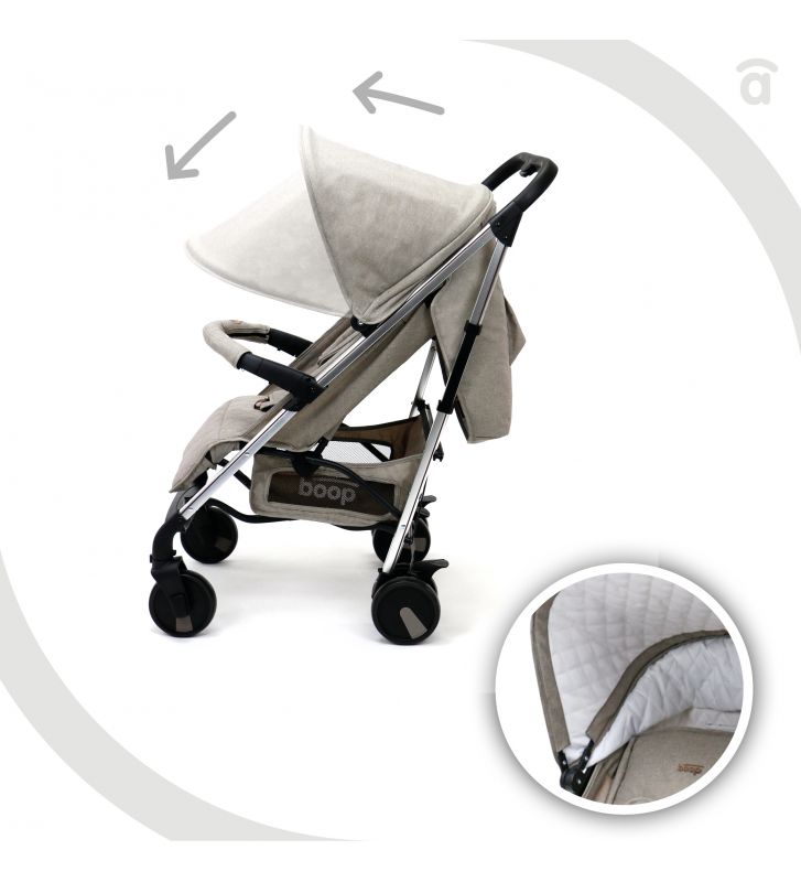 - Doble capota con interior acolchado, bolsillo, y ajustable en 3 posiciones con ventana