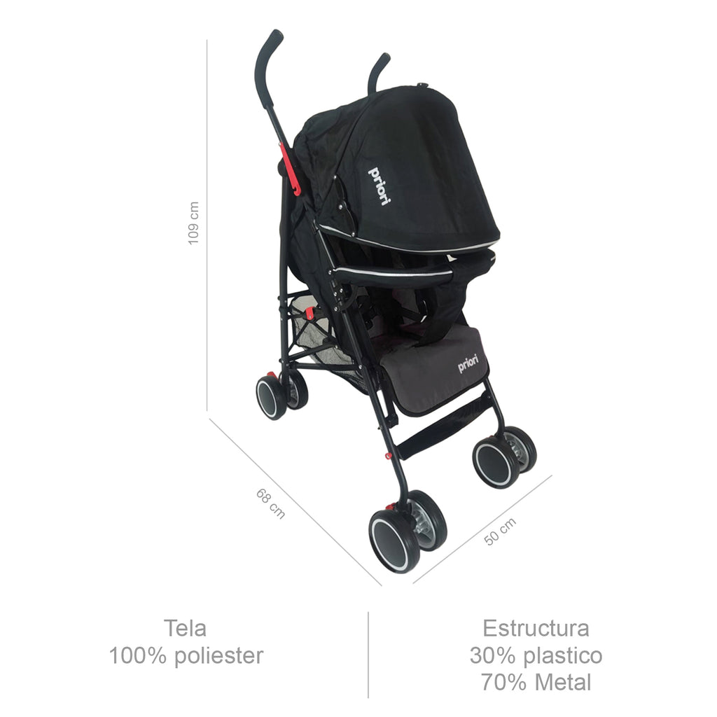 Coche paseador Priori plegado tipo sombrilla cuenta con 5 posiciones de reclinado, capota redonda expandible, cinturón de seguridad de 5 puntos, visor, amplia canasta, frenos traseros individuales y bloqueo de ruedas delanteras.