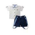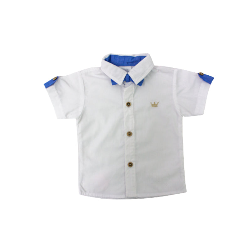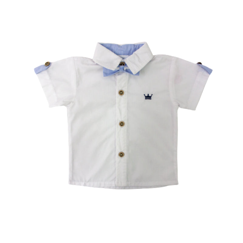 Conjunto niño con camisa blanca manga corta y corbatín y pantalón clásico en tela lino con tirantes en forma de Y en la espalda.