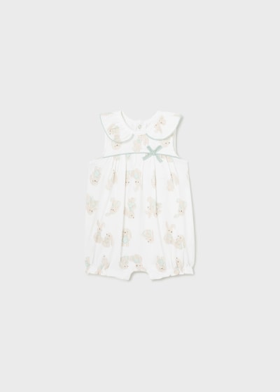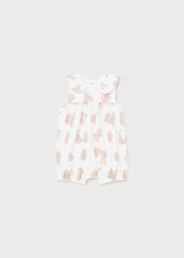 Pijama sin mangas para recién nacido. Cuello redondo. Cierre con un único botón a presión. Botones a presión en la entrepierna para facilitar la puesta de la prenda. Elementos de adorno: volantes decorativos.