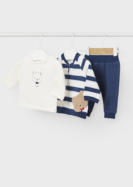 Prenda ECOFRIENDS, contiene algodón sostenible. Chándal de tres piezas para recién nacido compuesto por una sudadera, un pantalón largo deportivo y una camiseta a juego.