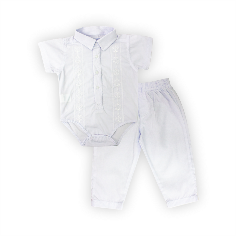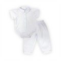Conjunto para bautismo, body tipo camisa, manga corta con bordado y pantalón clásico liso.