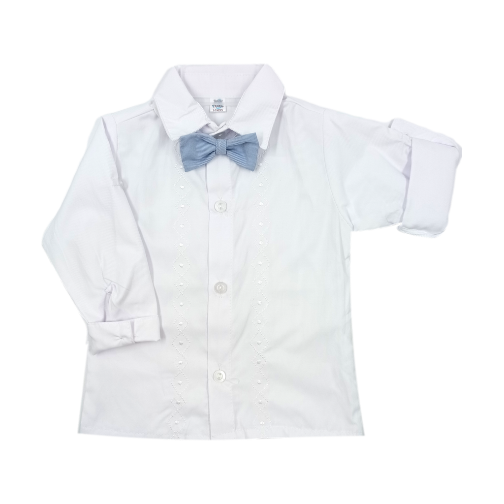 Conjunto para bautismo, camisa manga larga con bordado y pantalón de tela lino con chaleco y corbatín.
