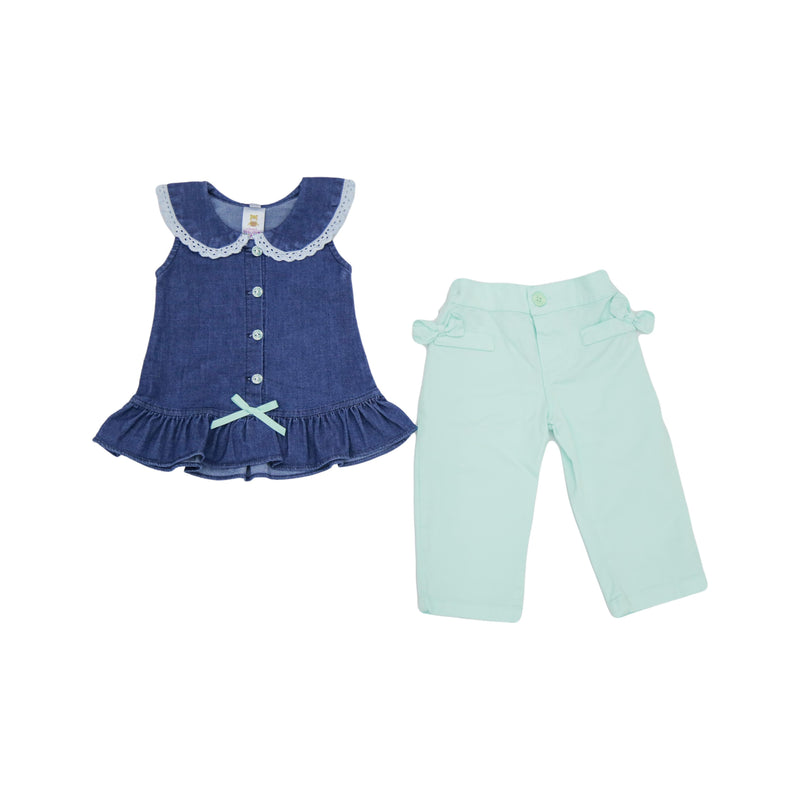 Conjunto niña con blusa unicolor sin mangas y con botones en el frente para facilidad del cambio de prenda, pantalón unicolor con bolsillos en la parte de atrás y cintura ajustable para mayor comodidad.