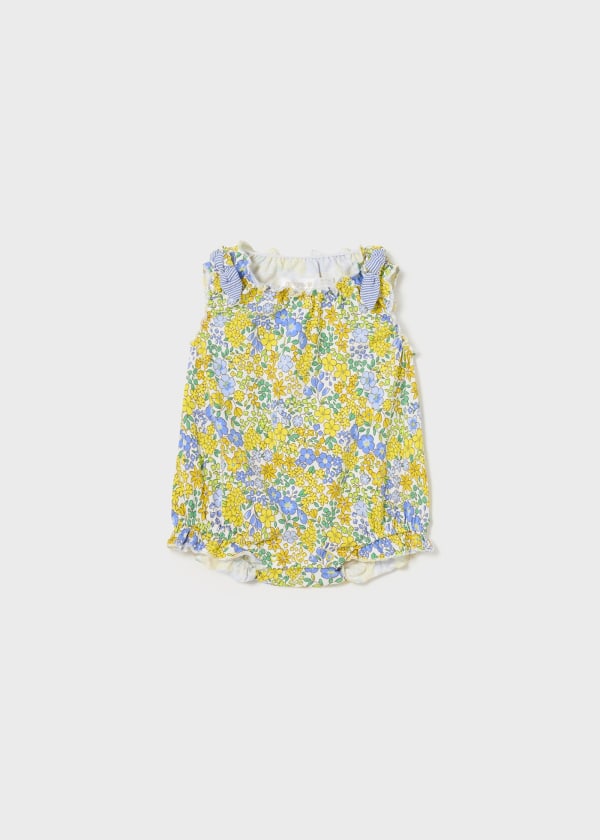 Pelele sin mangas para recién nacido. Cierre con botones a presión en la parte posterior. Botones a presión en la entrepierna para facilitar la puesta de la prenda. Elementos de adorno: lazo, volantes decorativos.