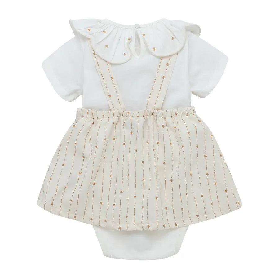 Conjunto body manga corta + jardinera para recién nacida niña de 0 a 24 meses. Con este conjunto no faltarán las pintas delicadas y auténticas en la primera etapa de vida de las bebés. Jardinera corta y body con detalle en cuello.