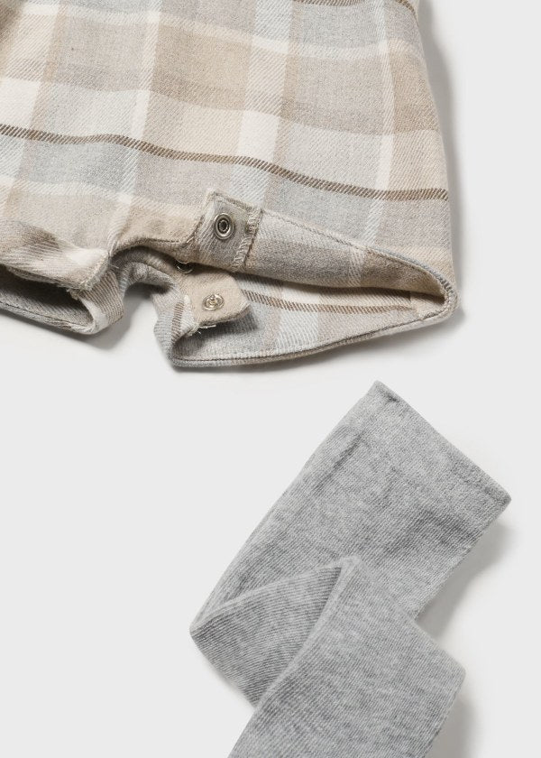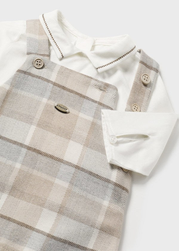¡Divino y tierno conjunto de overol, camisa y mallas a juego! Overol de estampado a cuadros, tirantes gruesos con boton ajustable, cierre de botones a presion. Camisa de cuello camisero, manga larga con botón en puños, cierre de botones por atrás y sus mallas con elástico en cintura para un mejor ajuste ¡El look más completo!