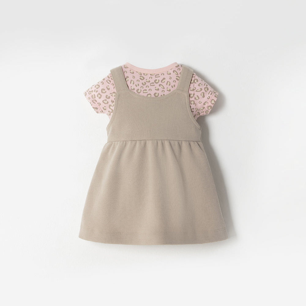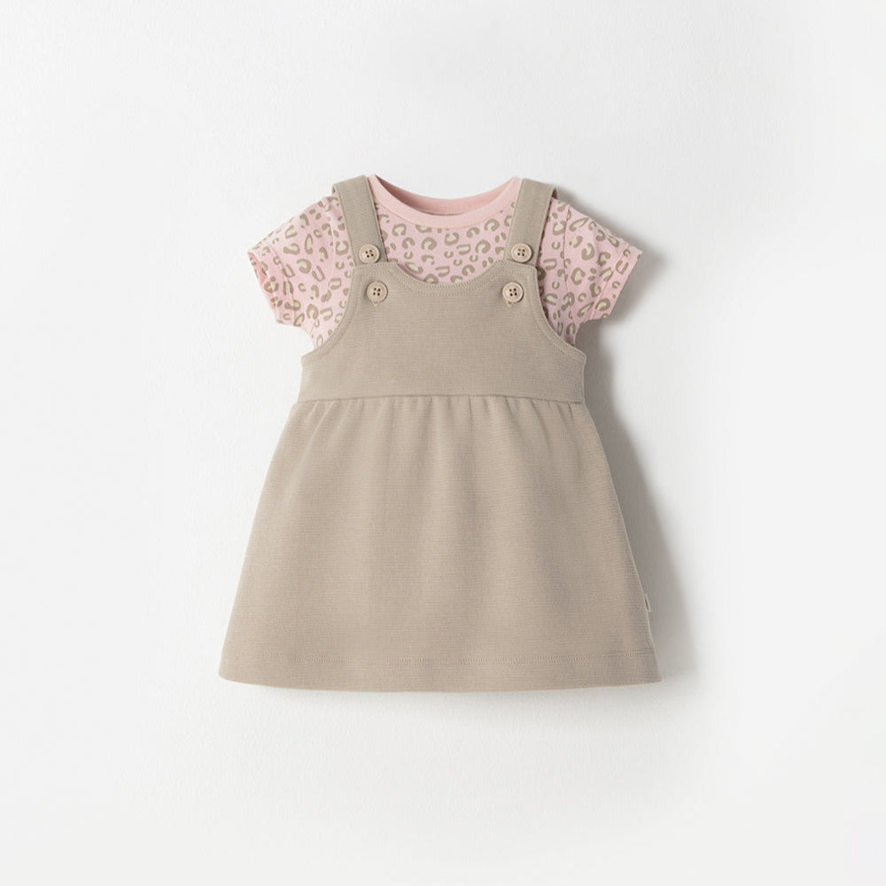 Body con botones de presión en la entrepierna para mayor facilidad al vestir. Vestido con cargaderas ajustables para adaptarse mejor al cuerpo y brindar mayor comodidad, ambas prendas con marquilla estampada para mayor comodidad