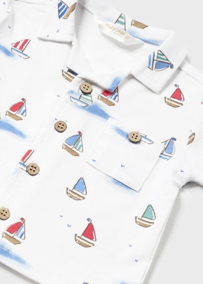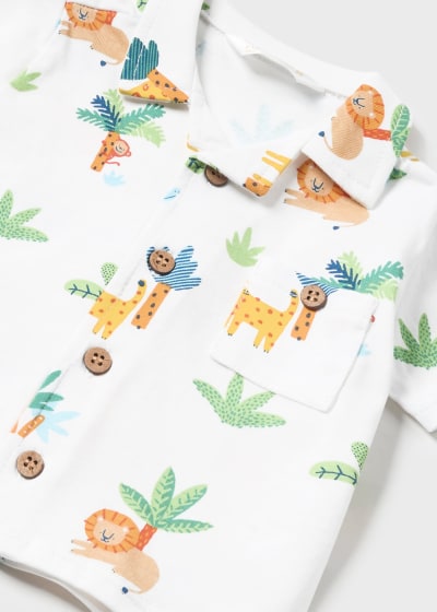 Camiseta de manga corta para recién nacido. Cuello redondo. Botón en el hombro para facilitar la puesta de la prenda. Diseño estampado.