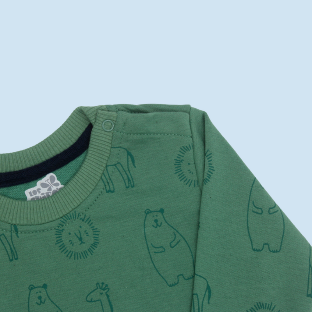 Conjunto 2 piezas, buso y pantalón largo con motivo de animalitos. Elaborado con tela en algodón que le brindará frescura y suavidad a tu pequeño a la hora de moverse y disfrutar de los juegos y actividades del día a día.