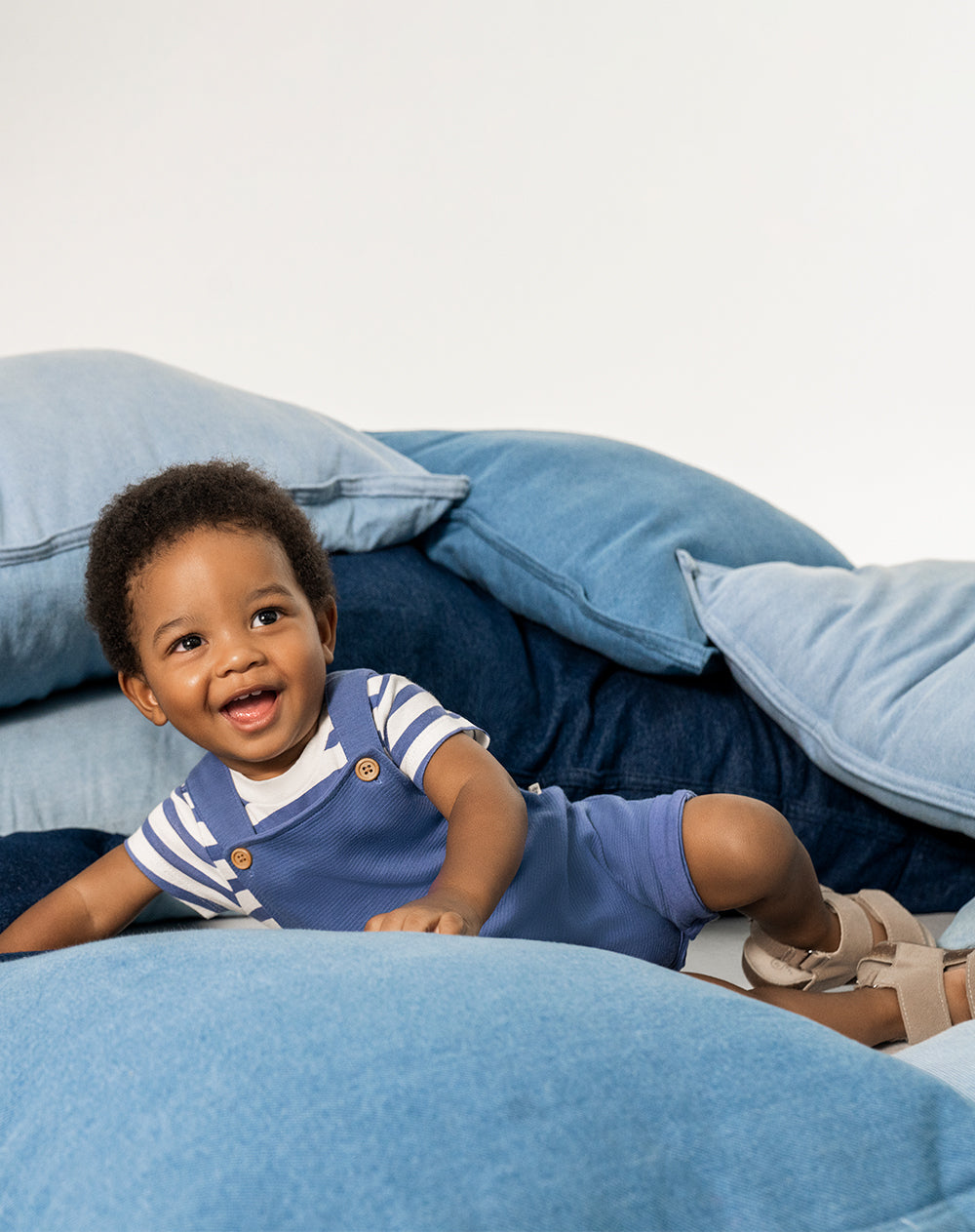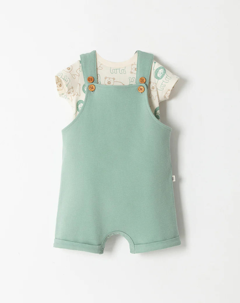 Conjunto de camiseta cuello redondo, manga corta y braga. Elaborado en algodón, el cual proporciona suavidad y frescura ideal para la piel del bebé.