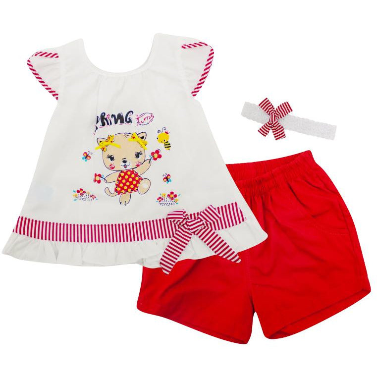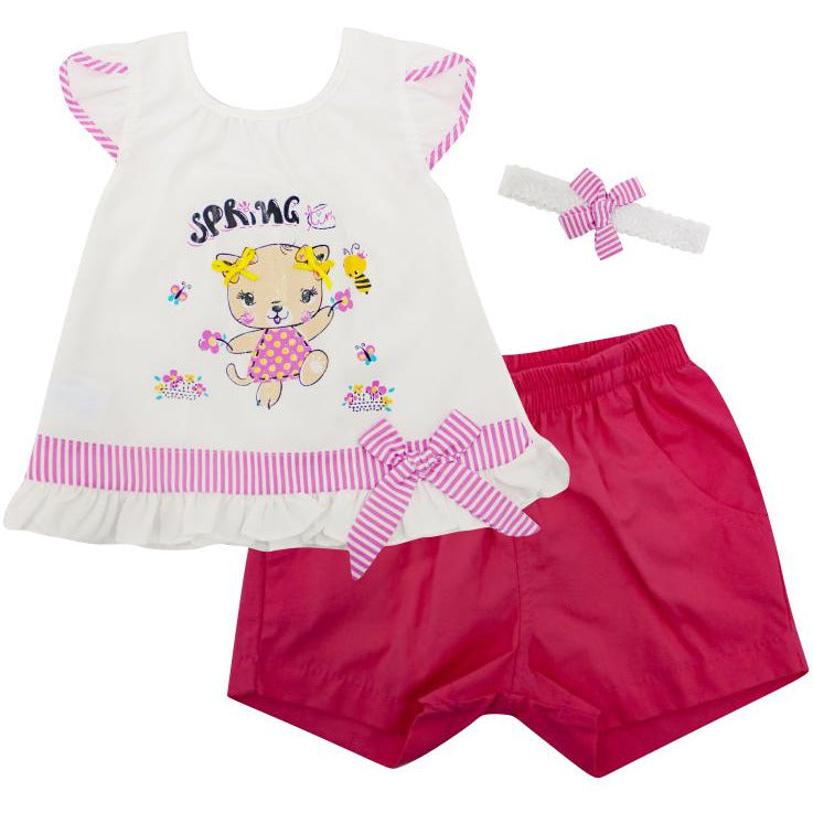 Conjunto para niña; camiseta con estampado manga corta, y short unicolor con bolsillos frontales.