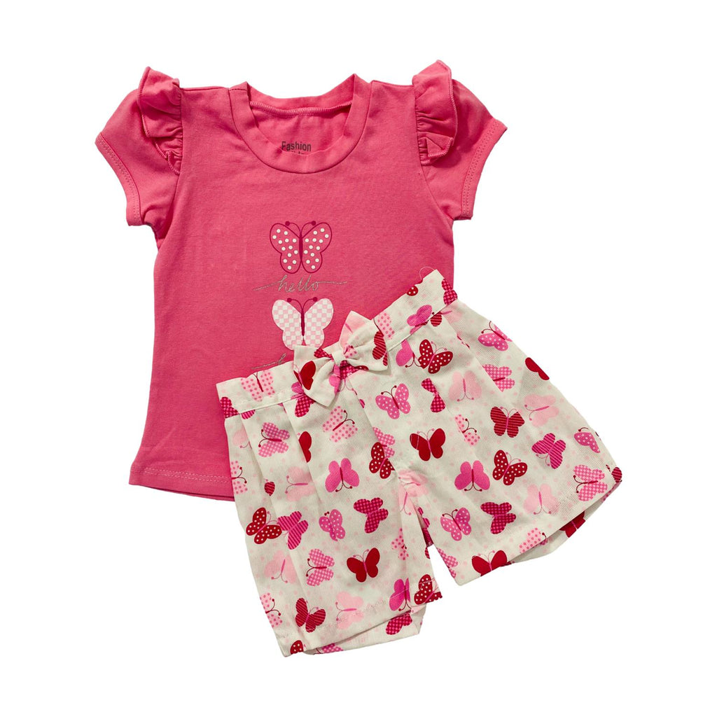 Conjunto niña, blusa unicolor con estampados, short con falsos bolsillos en la parte de atrás, estampados de corazones y detalle de lazo.
