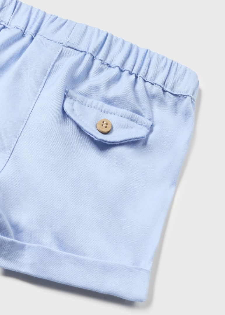 Pantalón de tipo bermuda con goma elástica en la cintura para un mejor ajuste. Detalle de bajo con vuelta. Bolsillo simulado decorativo en la parte trasera.