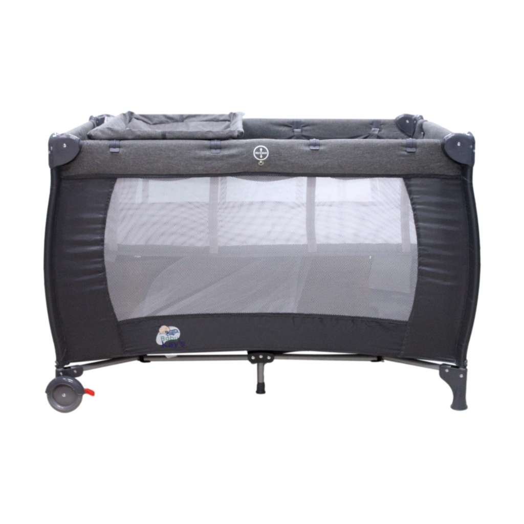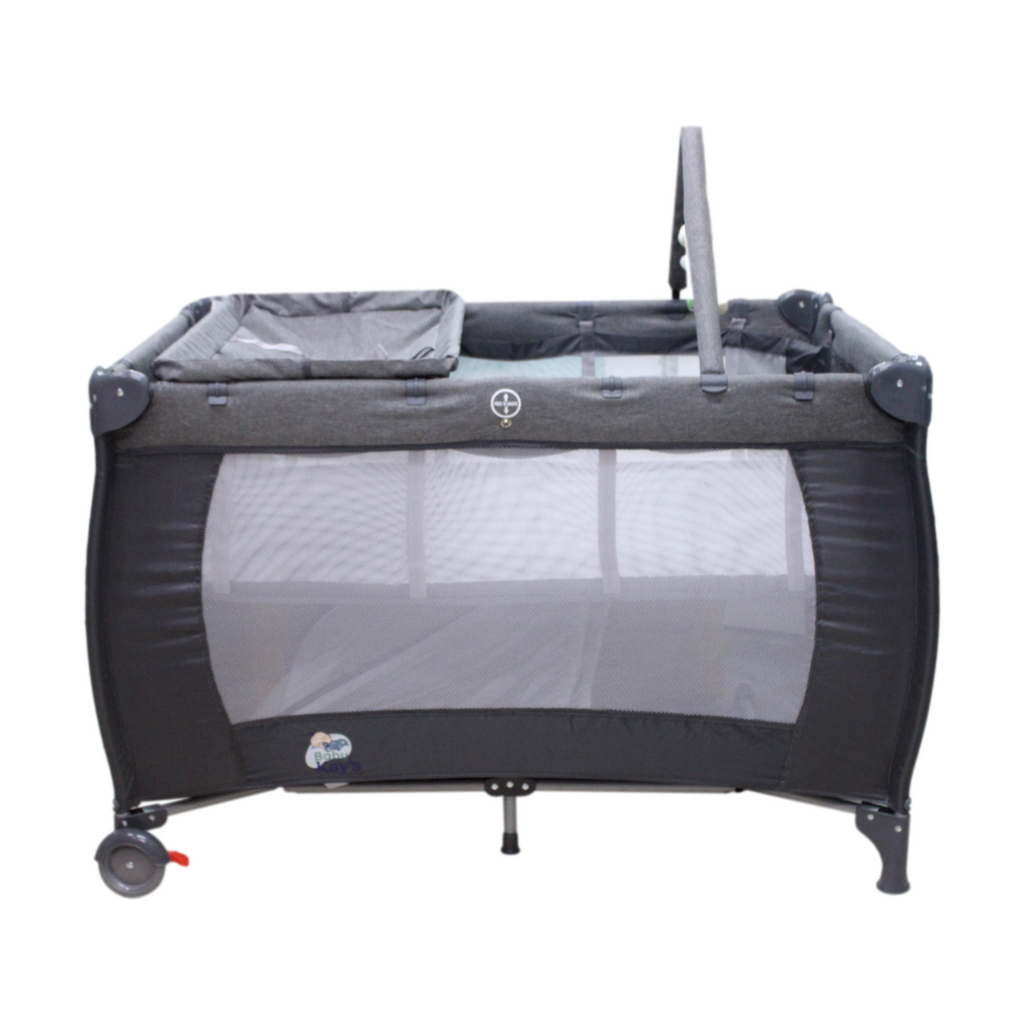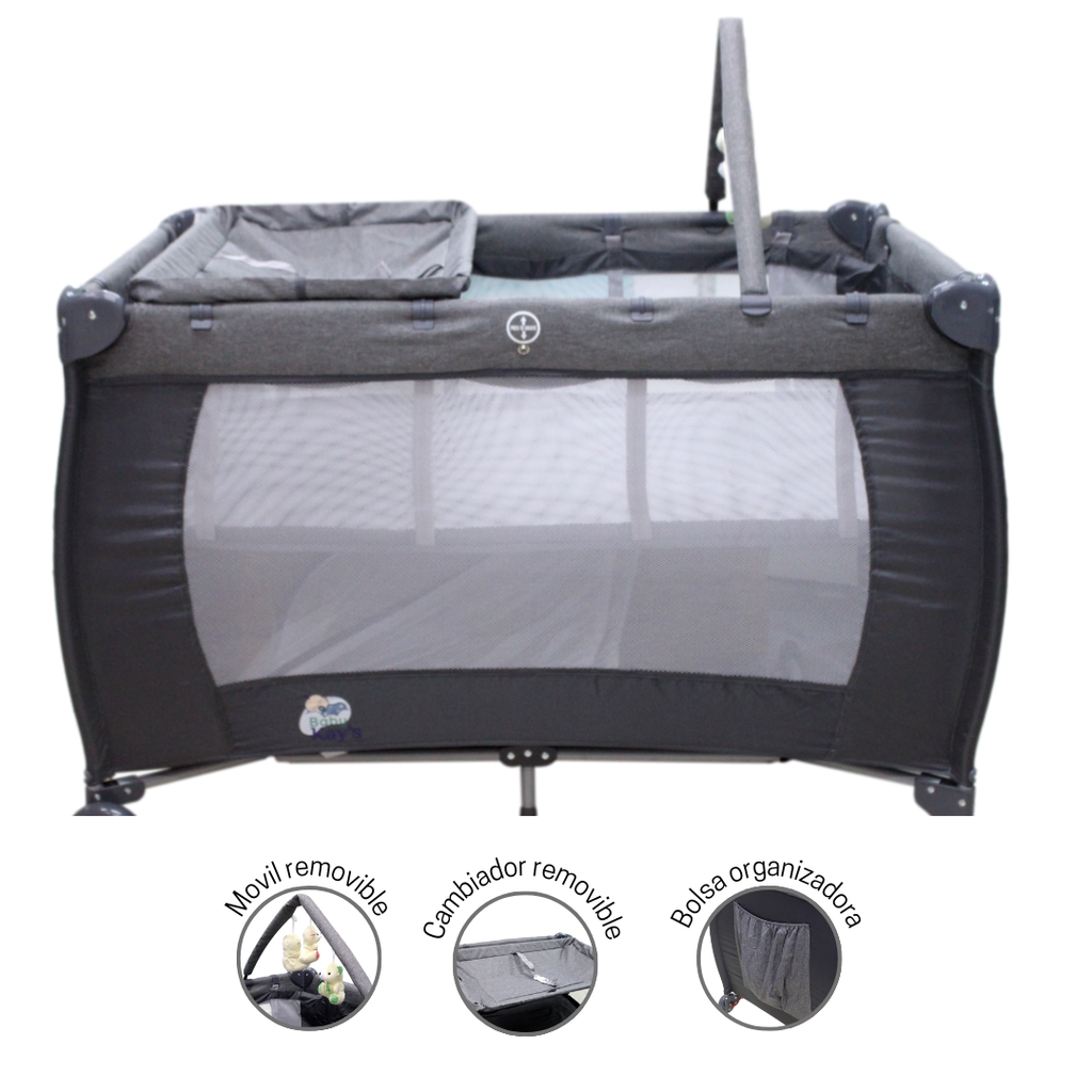 El bolso de traslado incluido permite transportar el corral con facilidad, mientras que su acabado en tonos grises modernos se adapta a cualquier espacio.