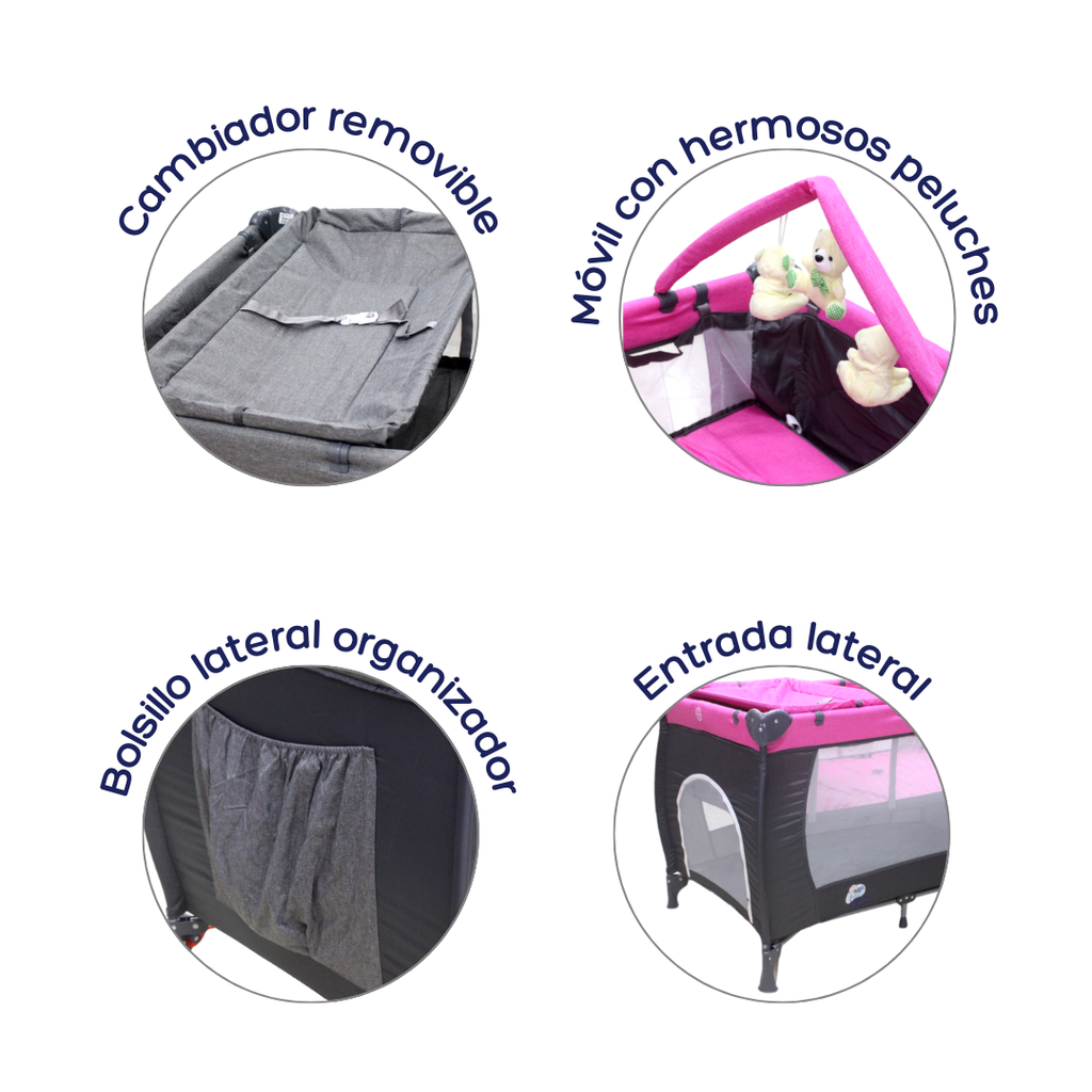 Su diseño incorpora un mosquitero que protege al bebé de insectos y permite una ventilación óptima. Además, cuenta con una estructura plegable que facilita su traslado y almacenamiento, convirtiéndolo en el compañero ideal para viajes o uso diario en casa.